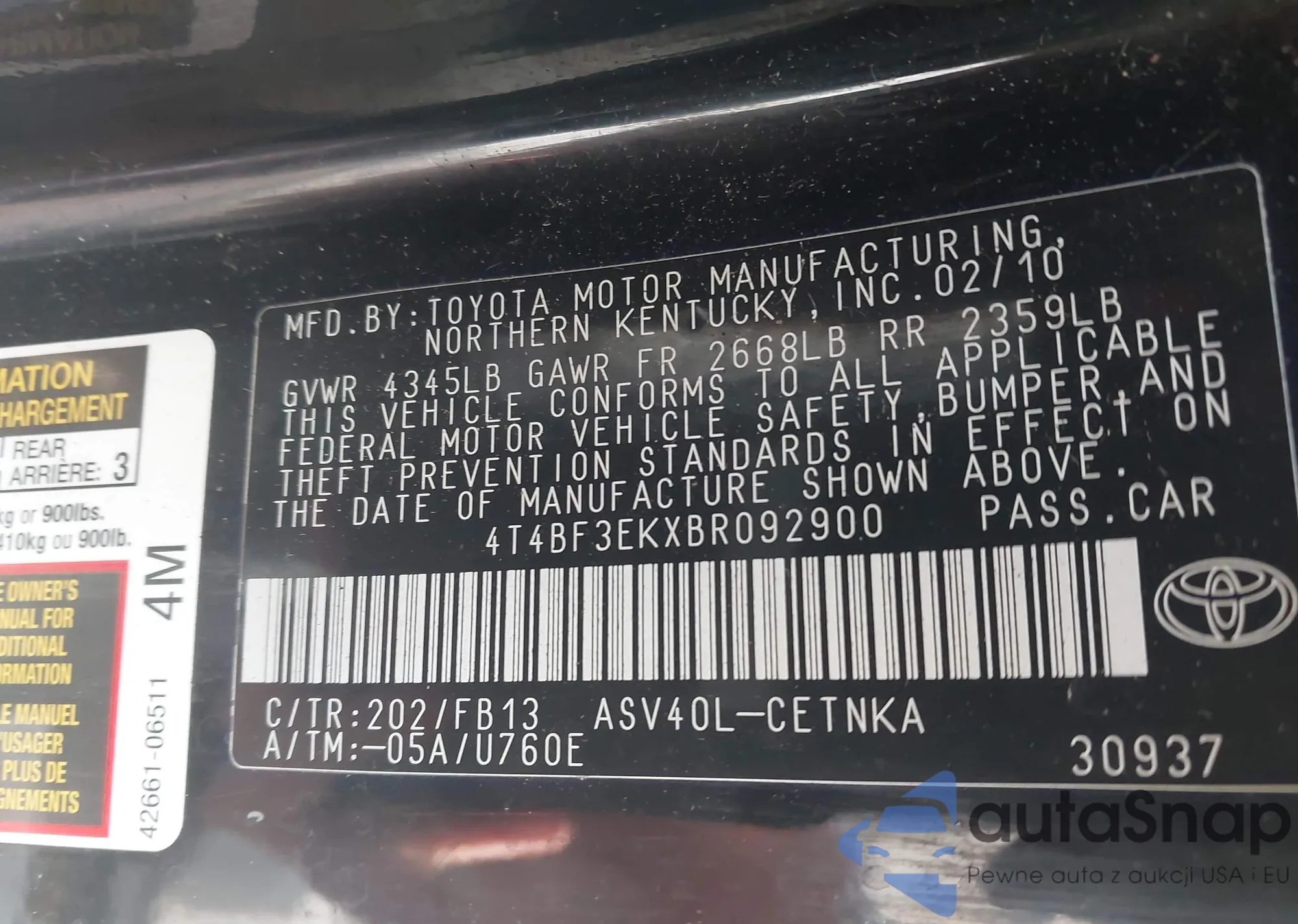 • VIN 4T1BK3DB0CU470781