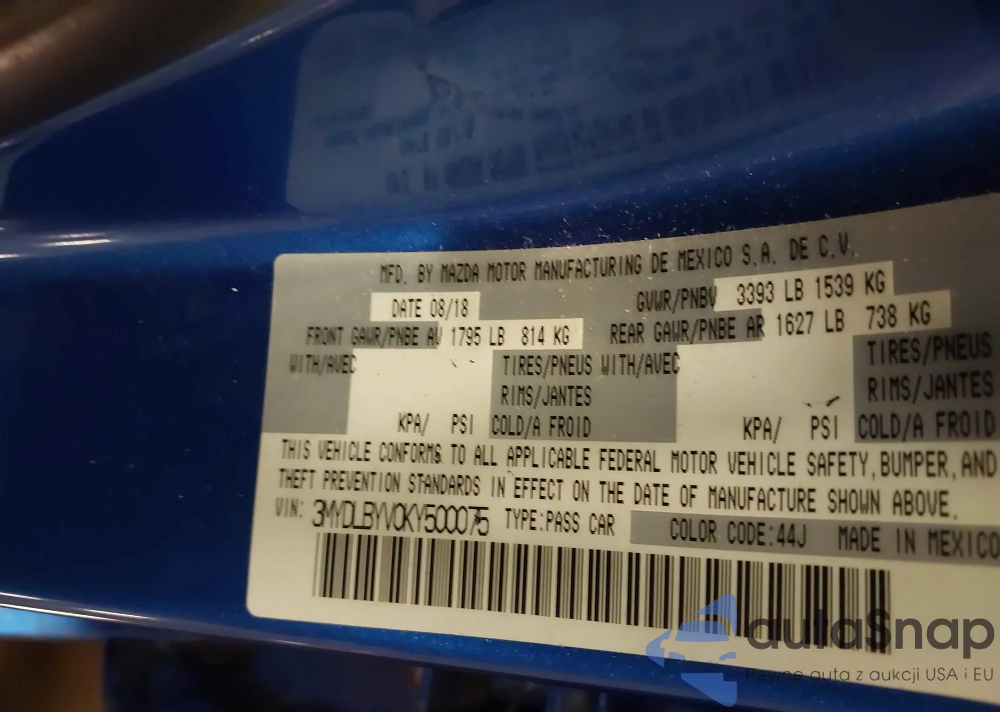 LOT: 44300741 VIN: 3MYDLBYV0KY500075