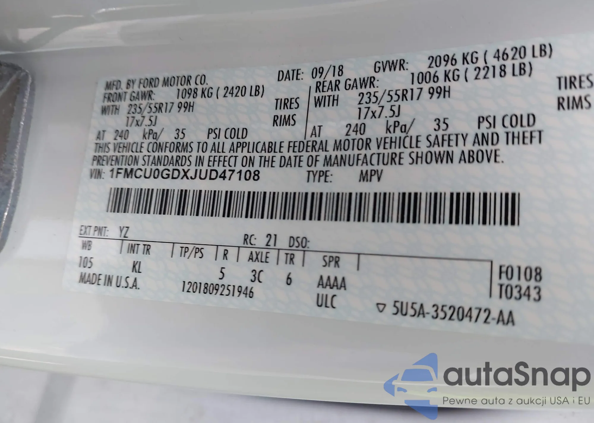 LOT: 43996060 VIN: 1FMCU0GDXJUD47108