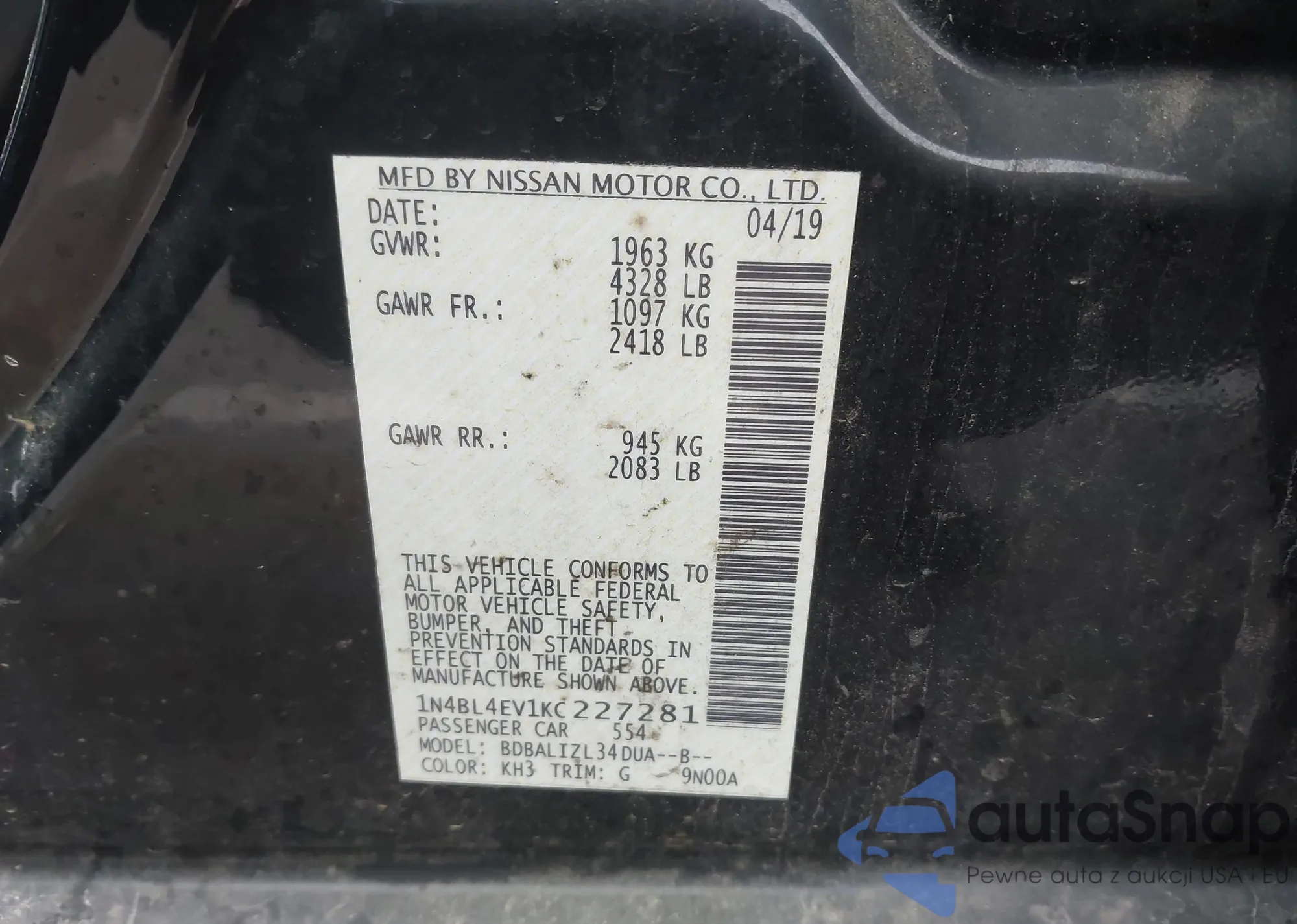 • VIN 1N4BL4EV1KC227281