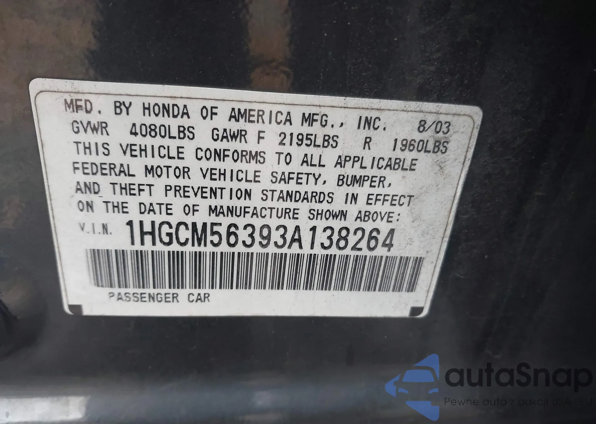LOT: 43801063 VIN: 1HGCM56393A138264