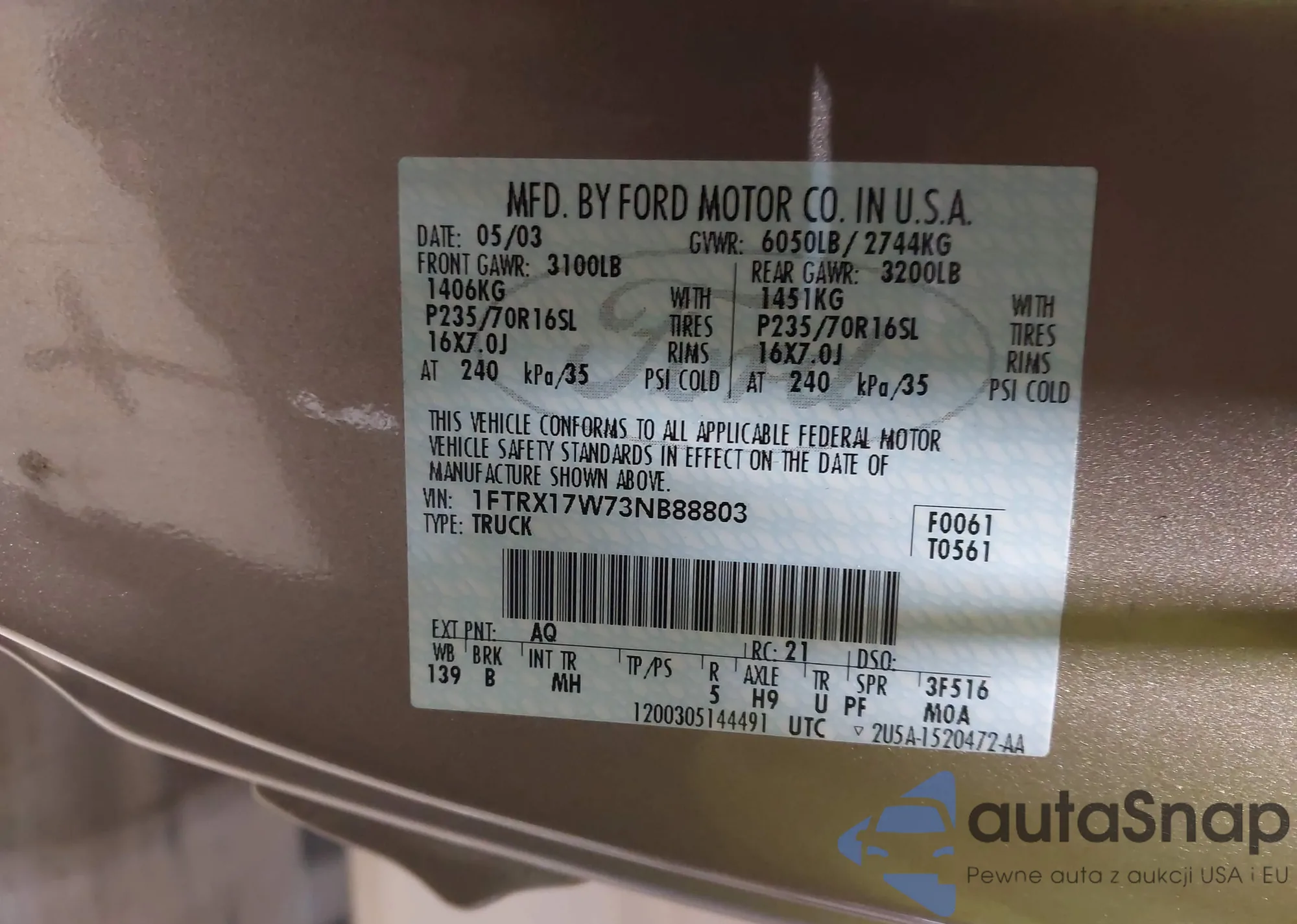• VIN 1FTFX1EV8AFA76001