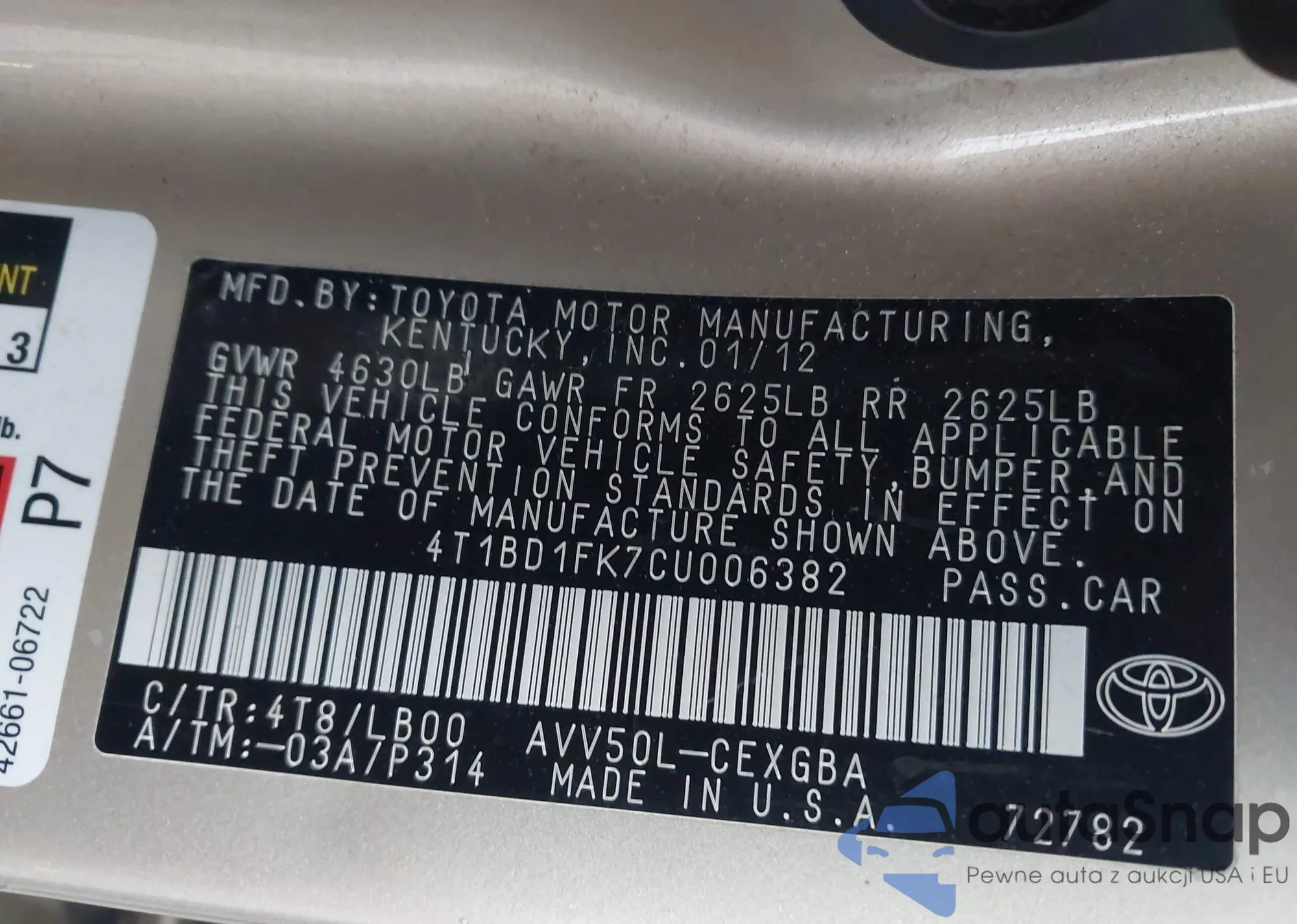 • VIN 4T1BD1FK7CU006382