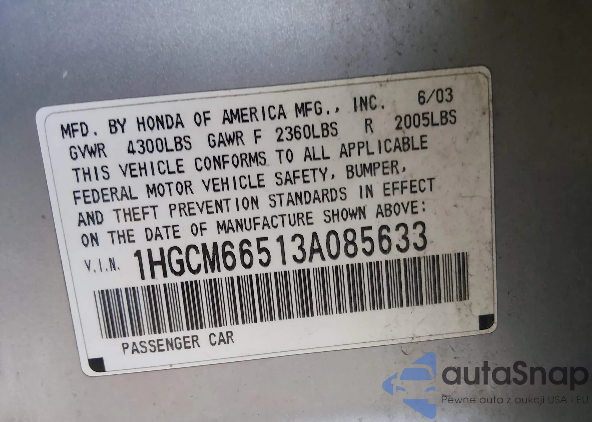 LOT: 43877292 VIN: 1HGCR2F61GA071059