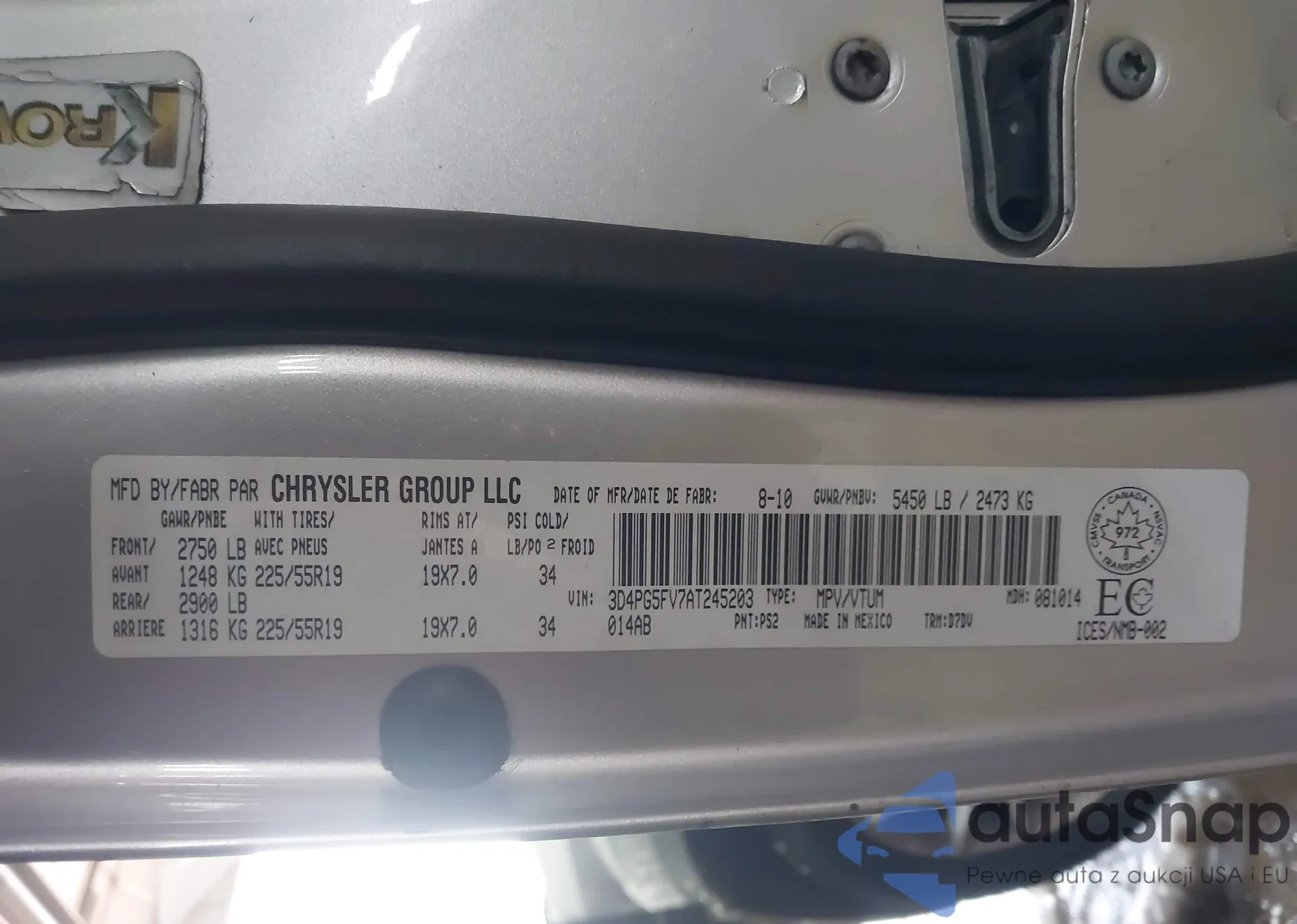 LOT: 43906573 VIN: 3D4PG5FV7AT245203