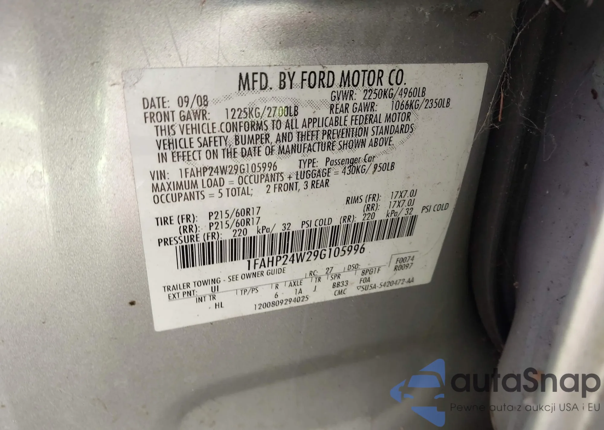 LOT: 43914631 VIN: 1FAHP24W29G105996