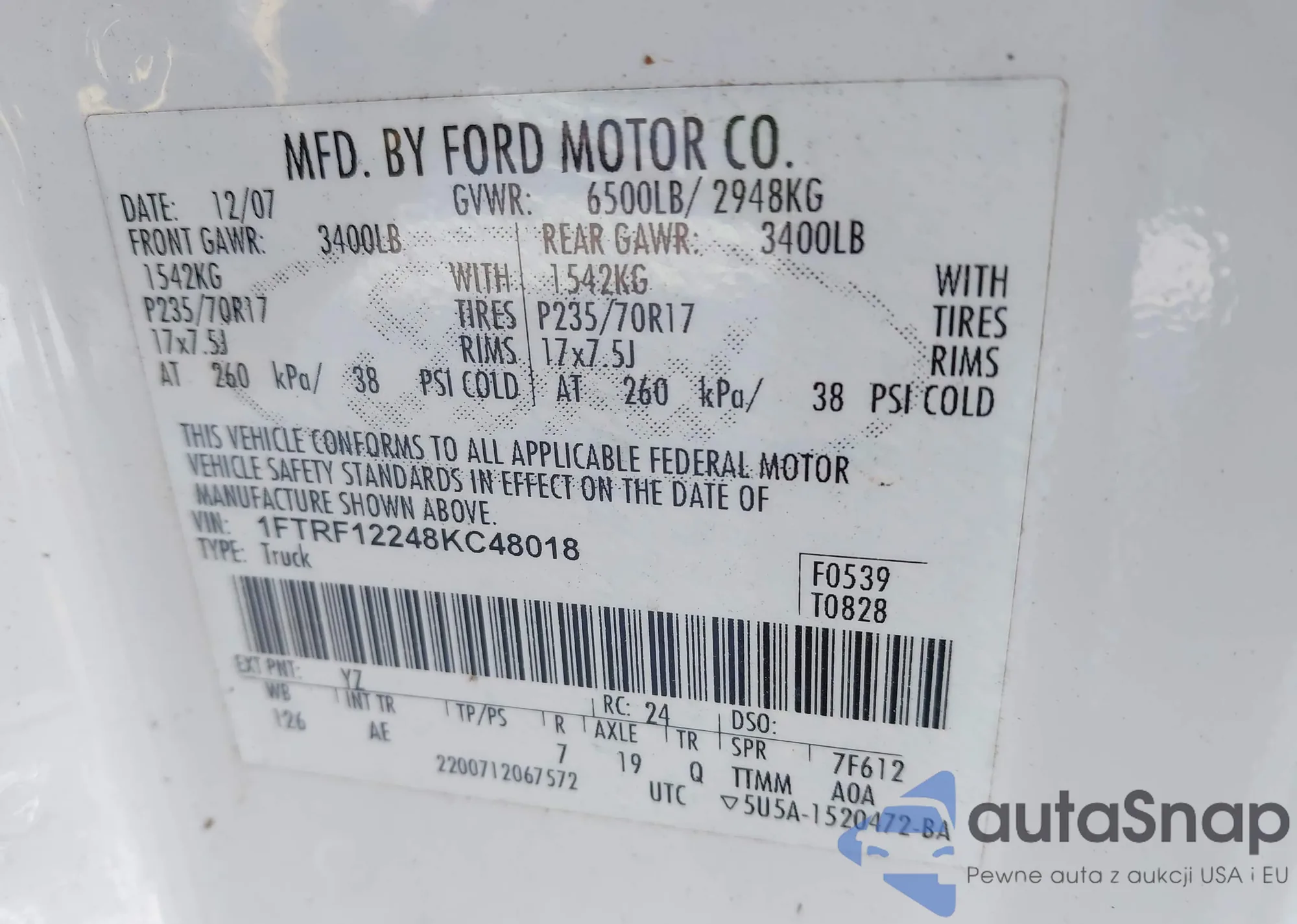 LOT: 44192653 VIN: 1FTRF12248KC48018