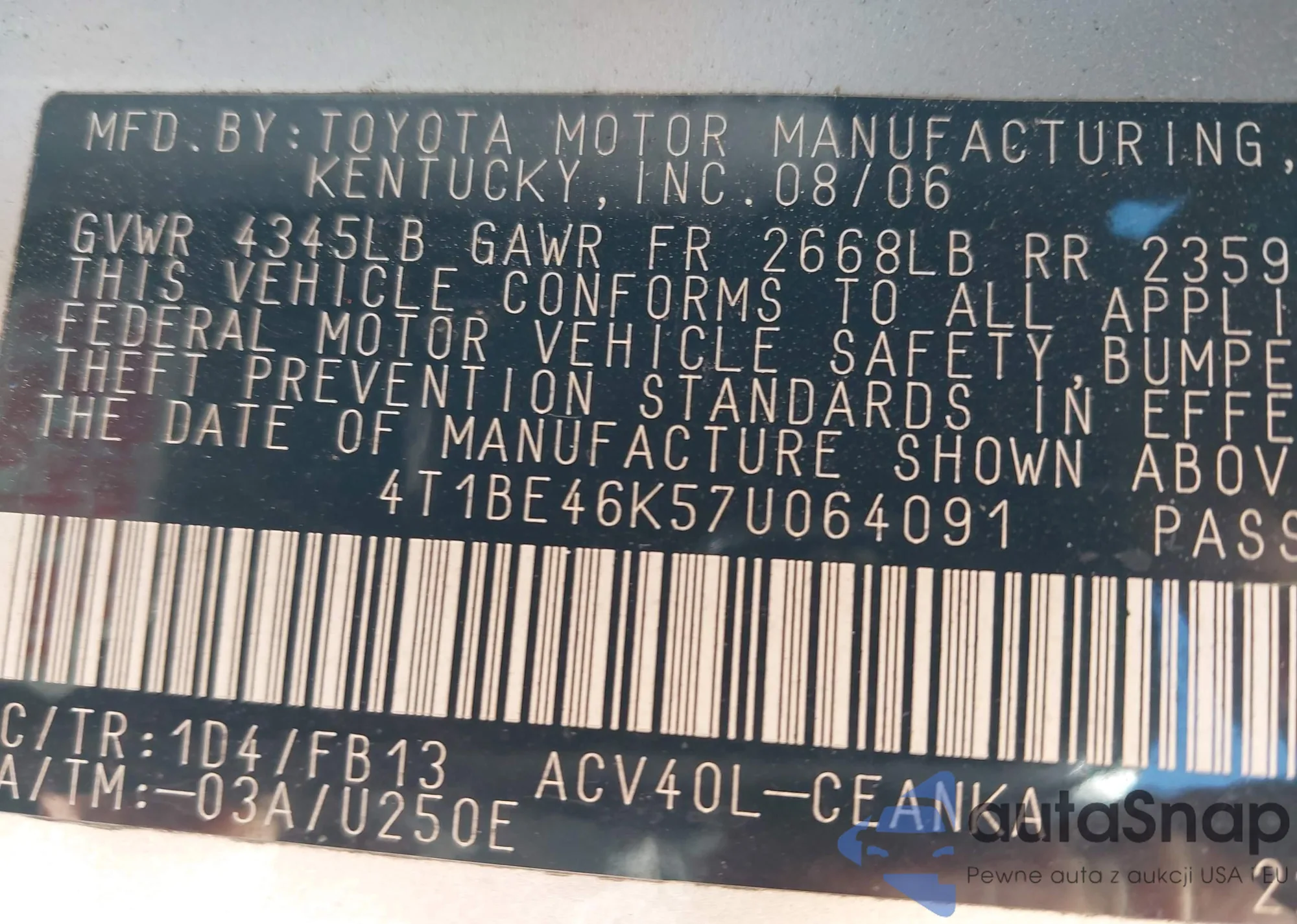 LOT: 44260585 VIN: 4T1BE46K57U064091