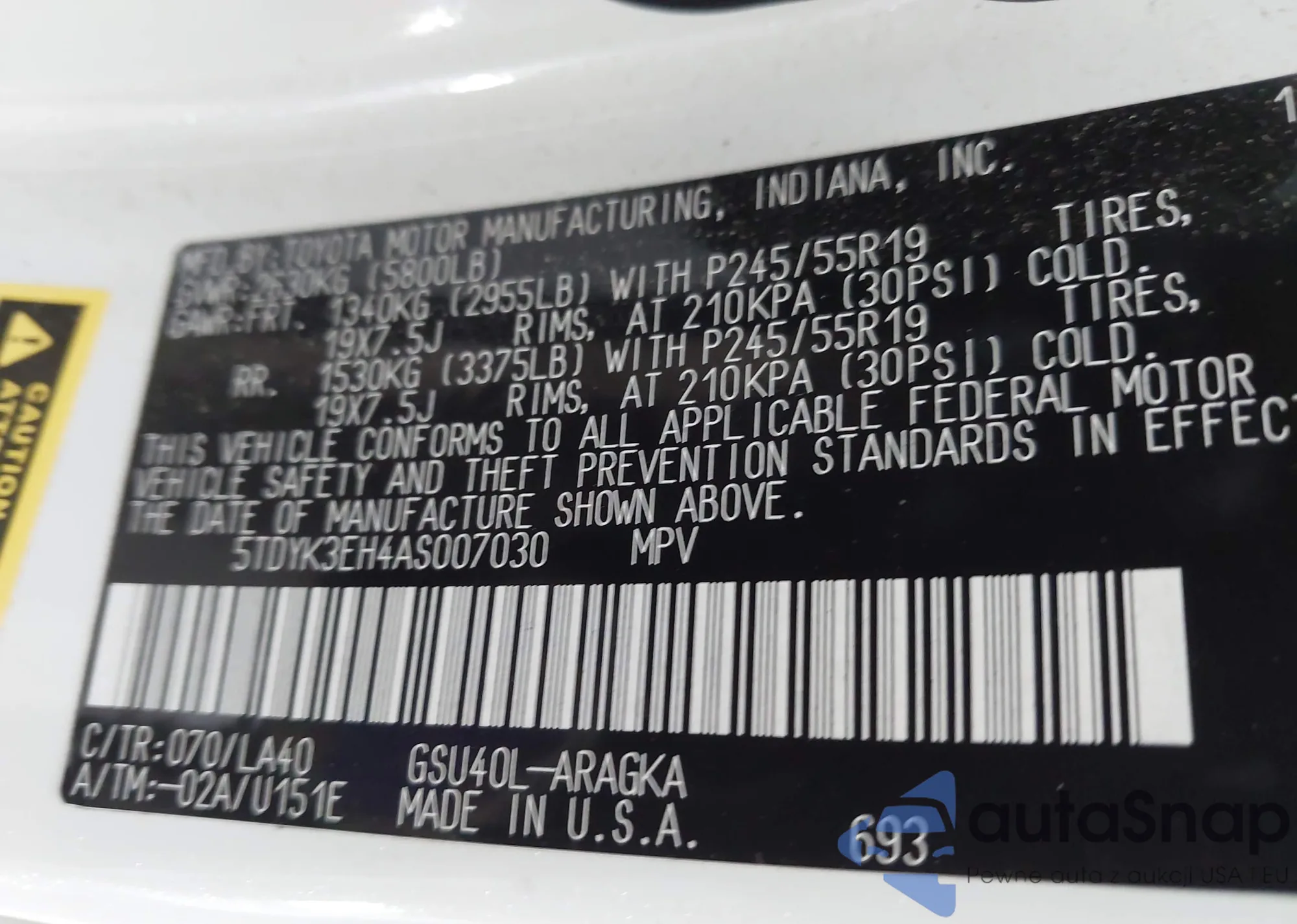 • VIN 5TDYK3EH4AS007030