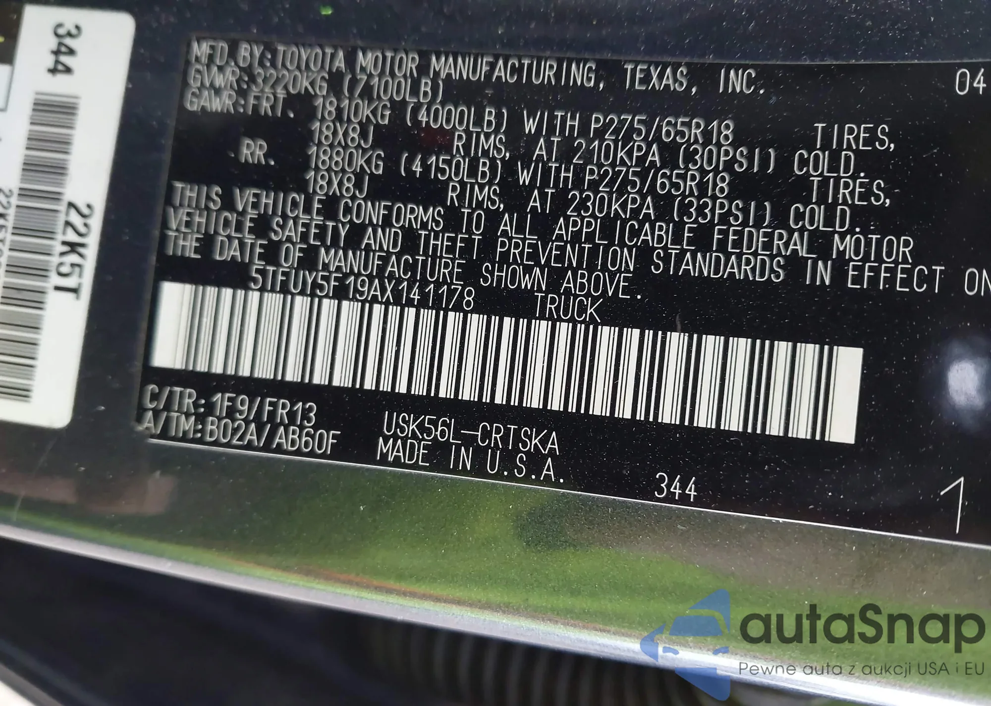 • VIN 5TFUY5F19AX141178