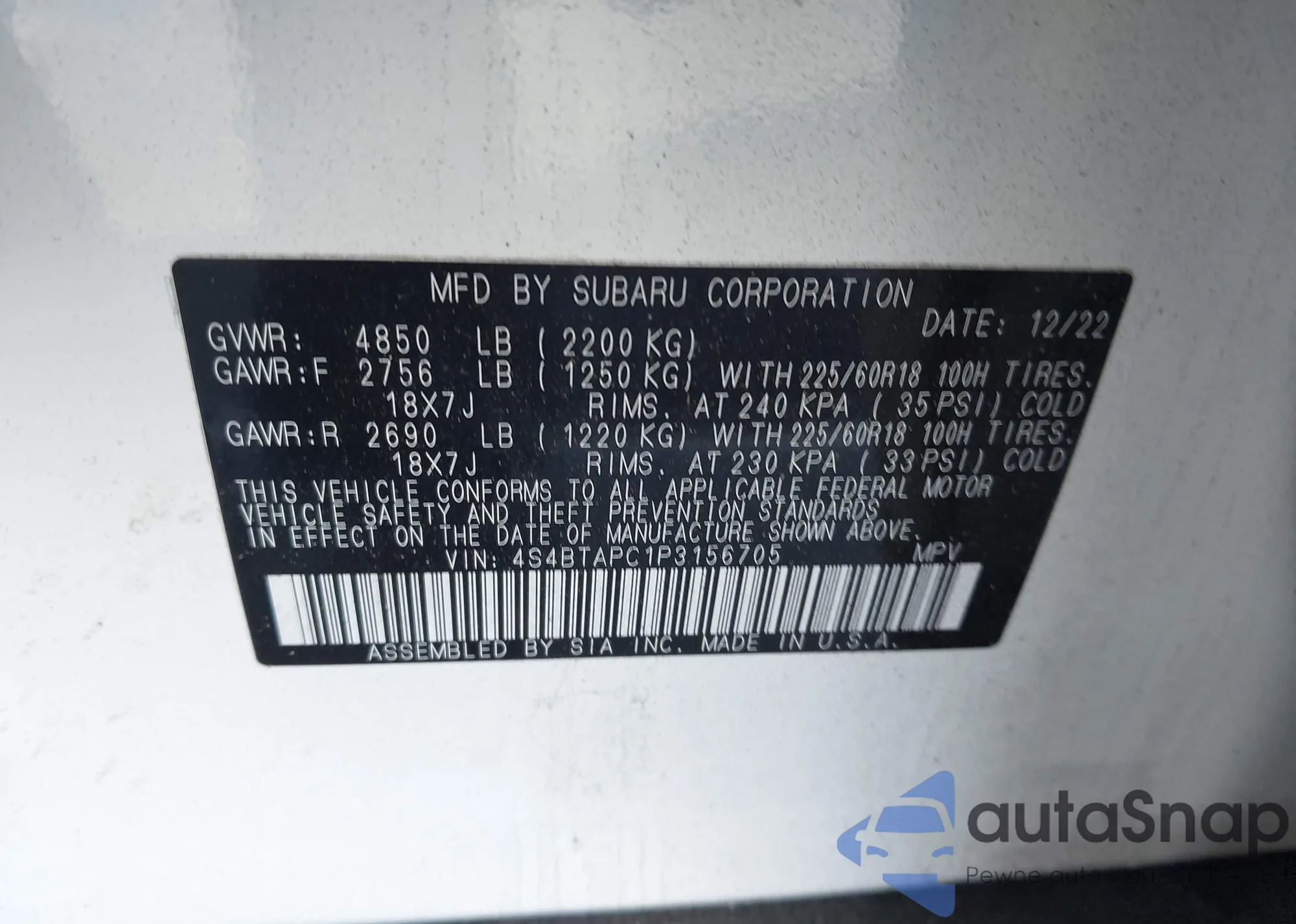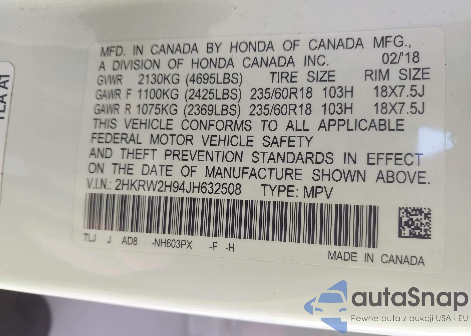 • VIN 2HKRW2H94JH632508