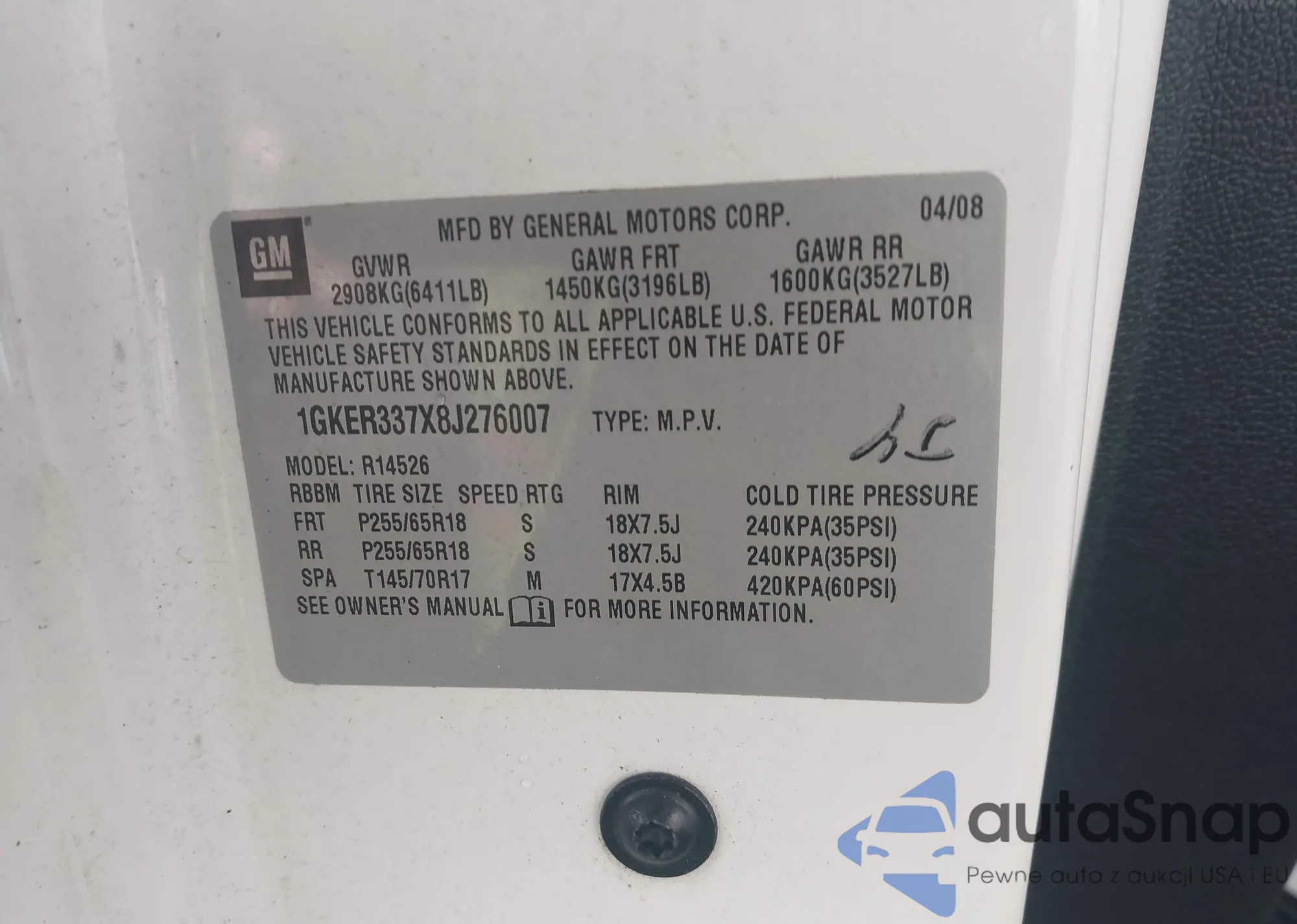 • VIN 1GKER337X8J276007