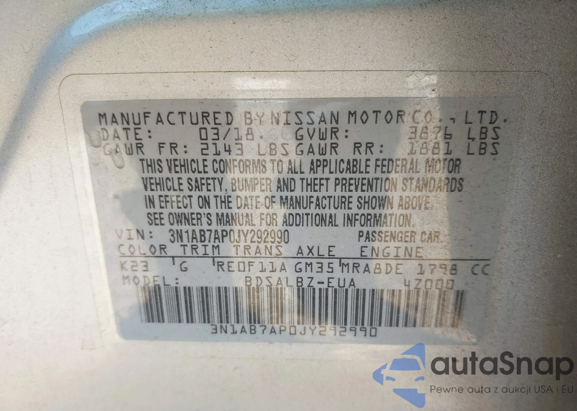 • VIN 3N1AB7AP0JY292990