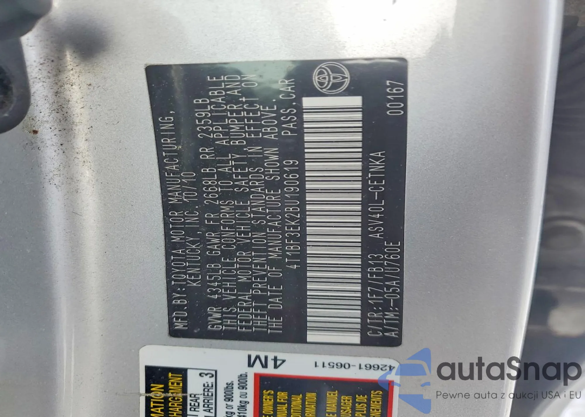 • VIN 4T1BF3EK2BU190619