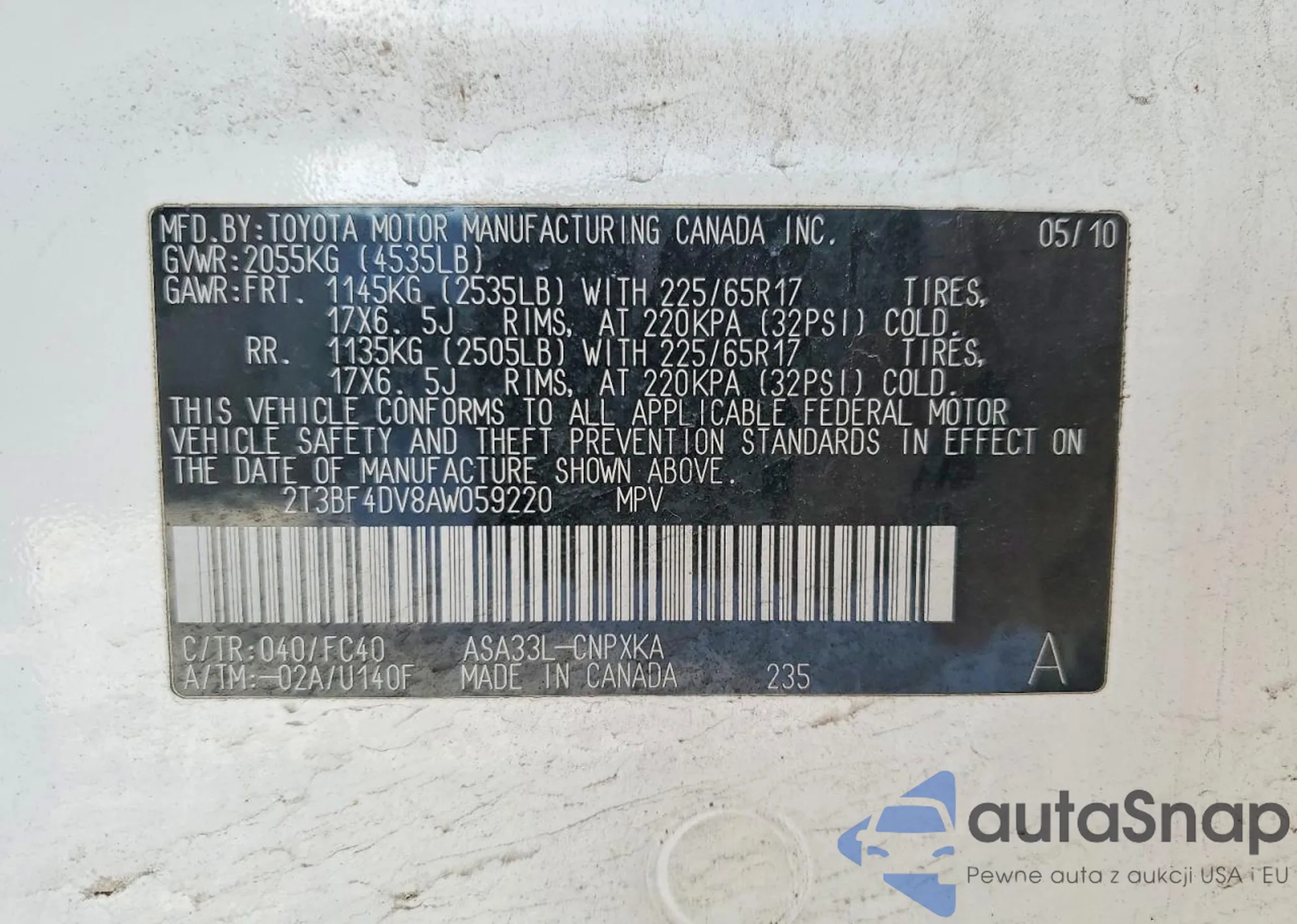 • VIN 2T3BF4DV8AW059220