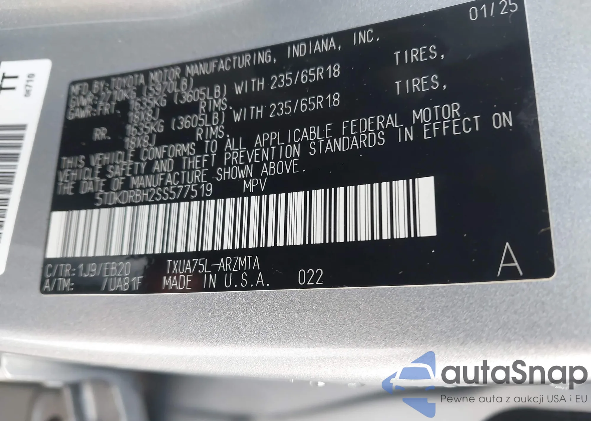 • VIN 5TDGARAH1NS511497