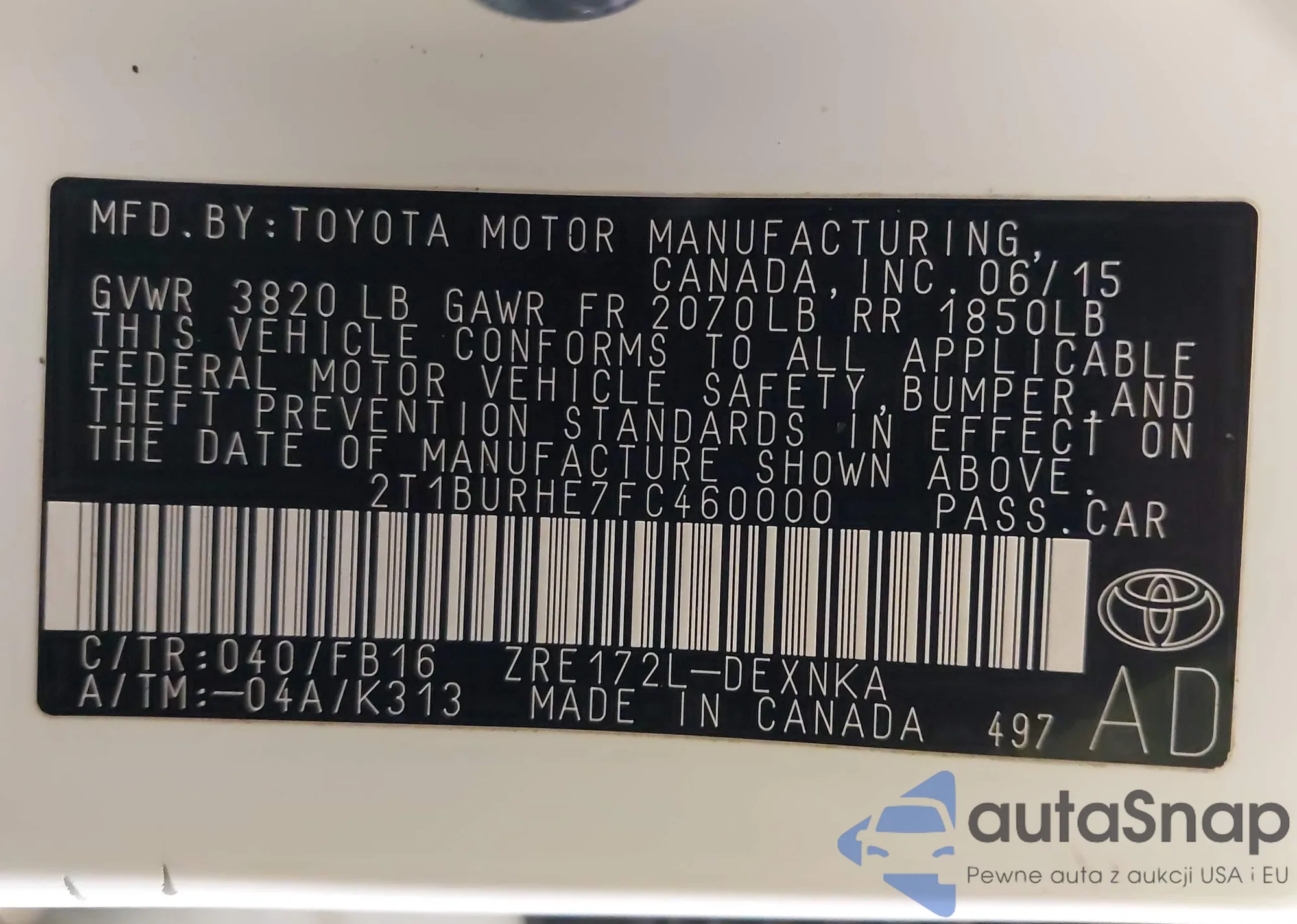 LOT: 44207317 VIN: 2T1BURHE1FC438249