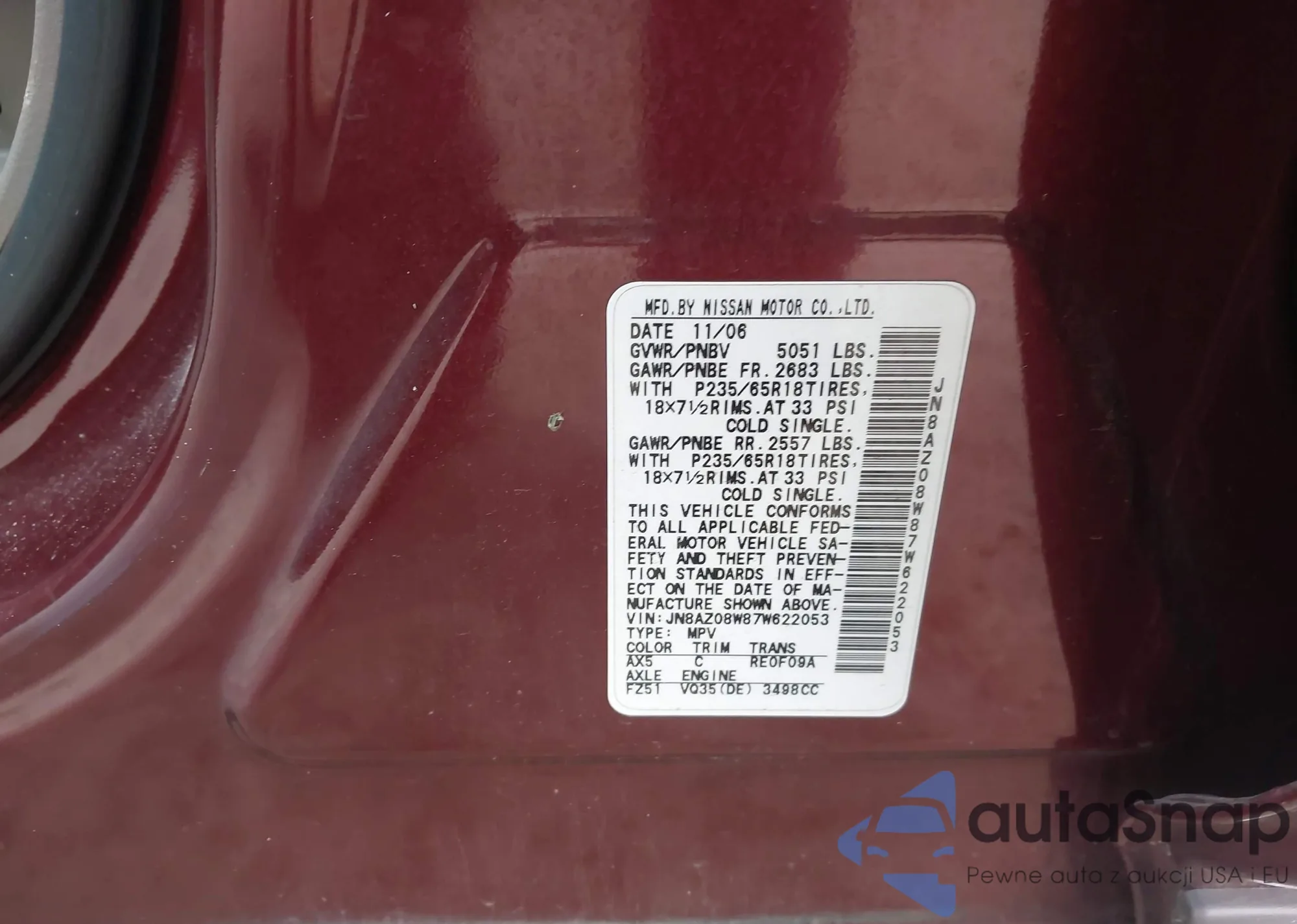 LOT: 44070362 VIN: JN8AZ08W87W622053