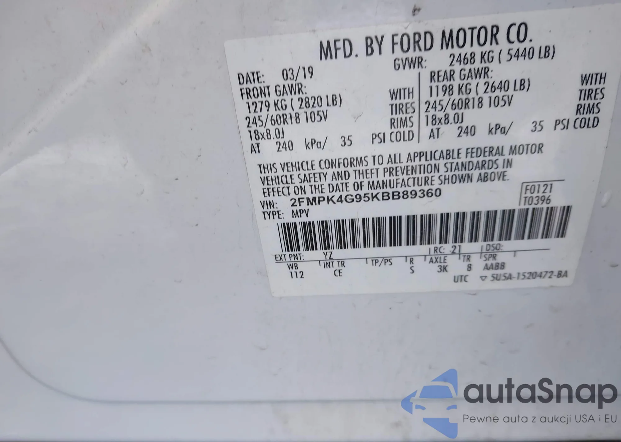 LOT: 44210541 VIN: 2FMPK4G95KBB89360