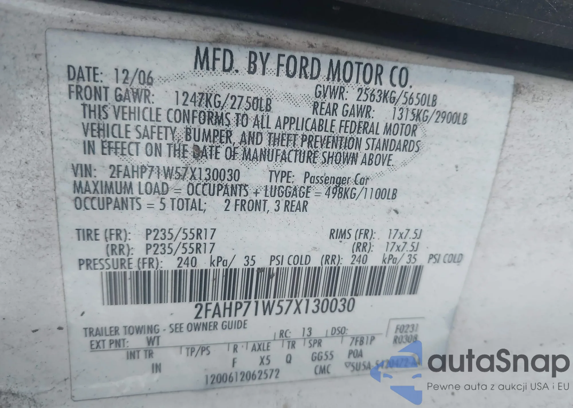LOT: 43945555 VIN: 2FAHP71W57X130030