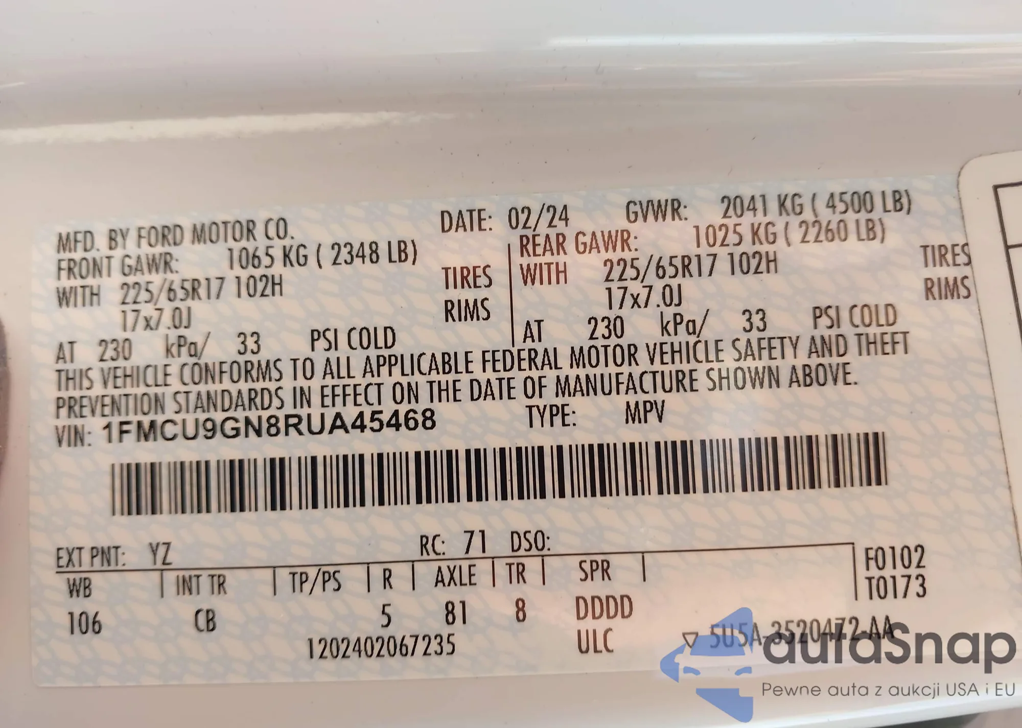LOT: 43549663 VIN: 1ZVBP8AM1C5246208