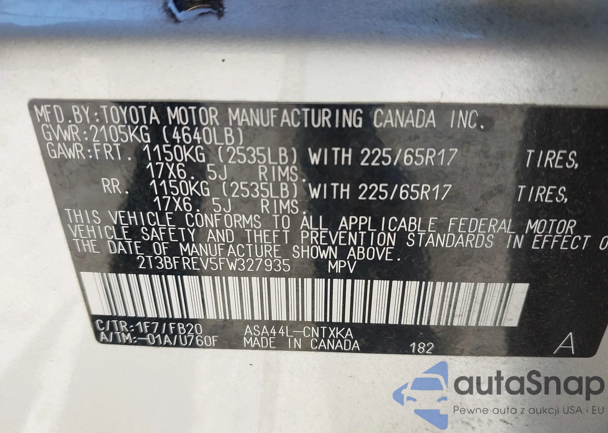 • VIN 2T3BFREV5FW327935