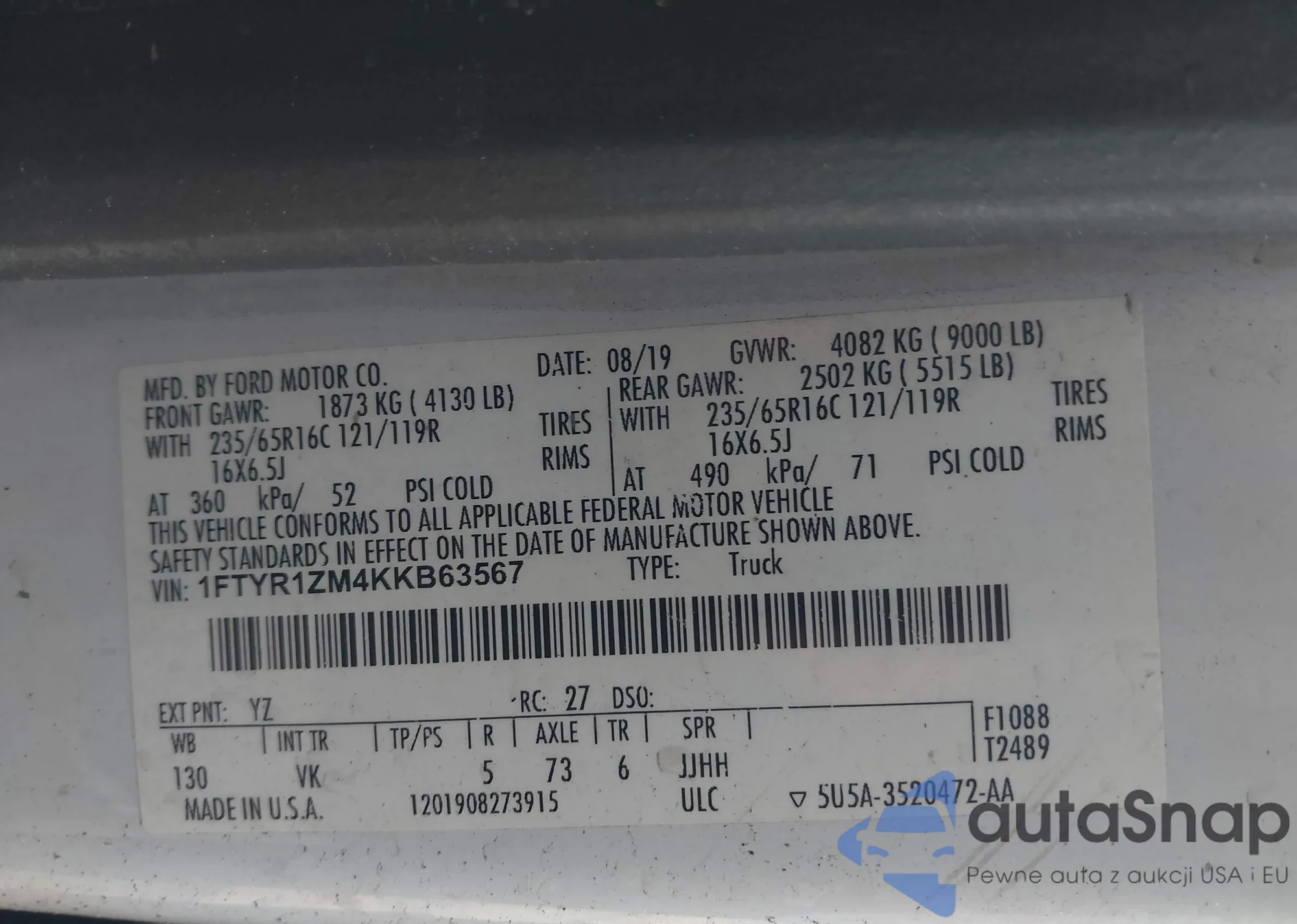 • VIN 1FTYR1ZM4KKB63567