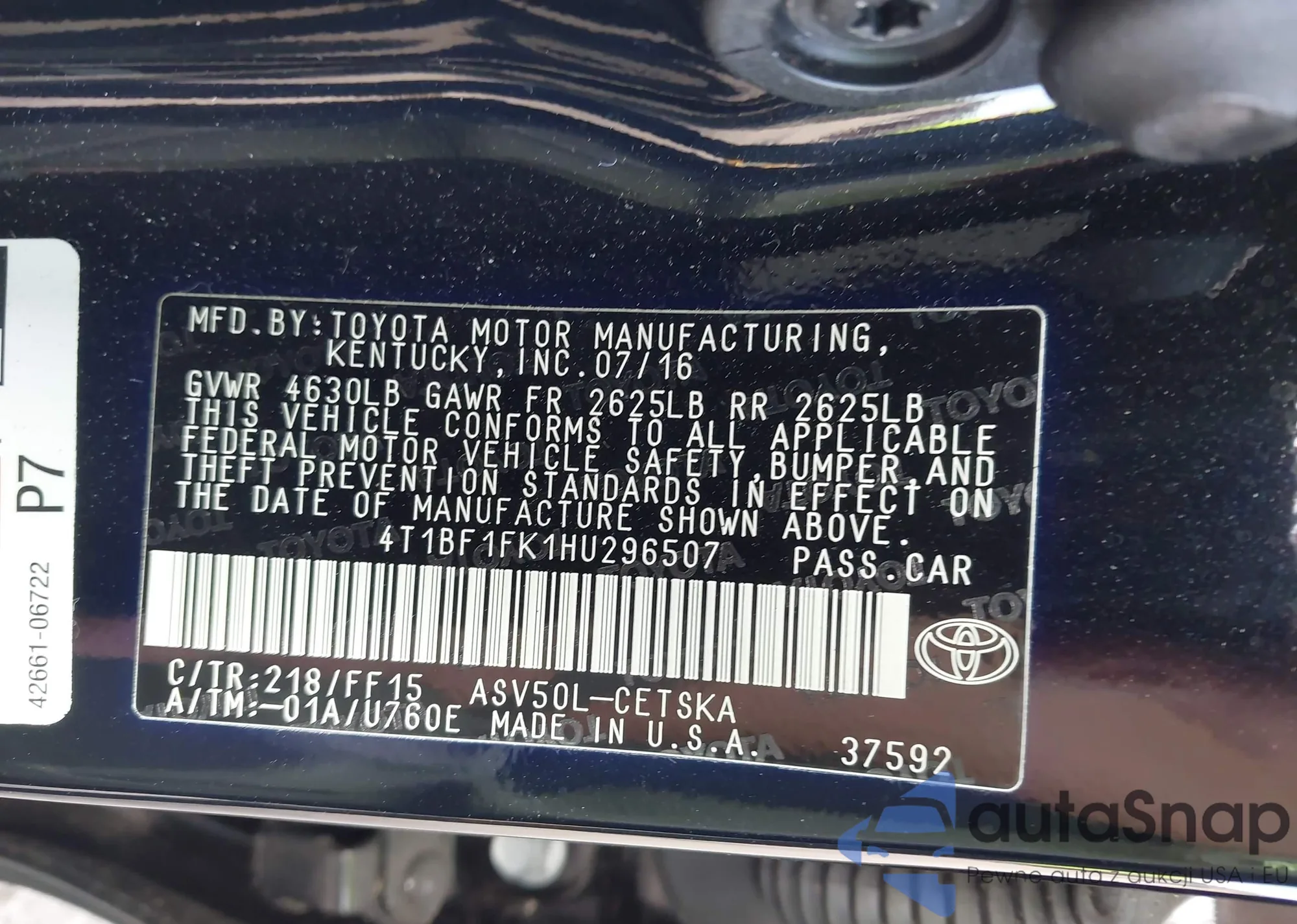 • VIN 4T1BF1FK1HU296507