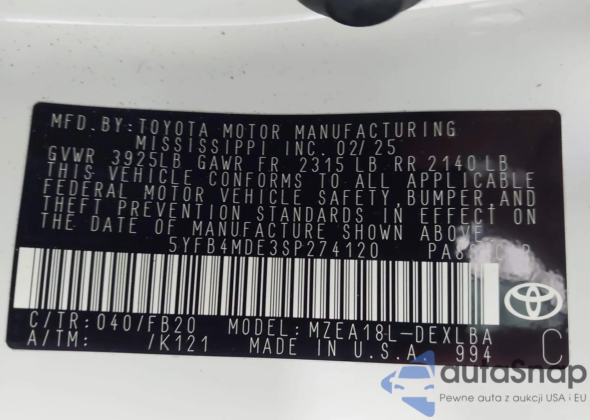 • VIN 5YFB4MDE3SP274120