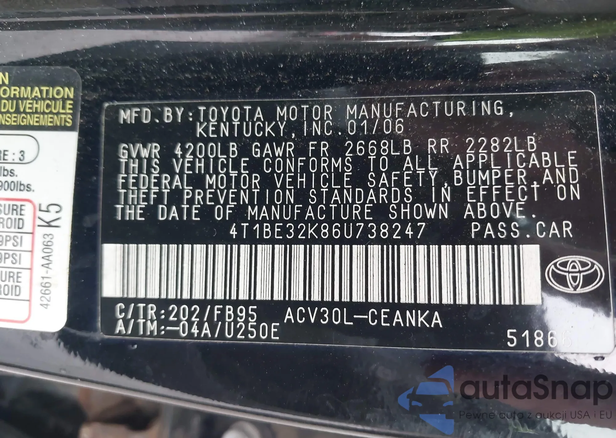 • VIN 4T1BE32K86U738247