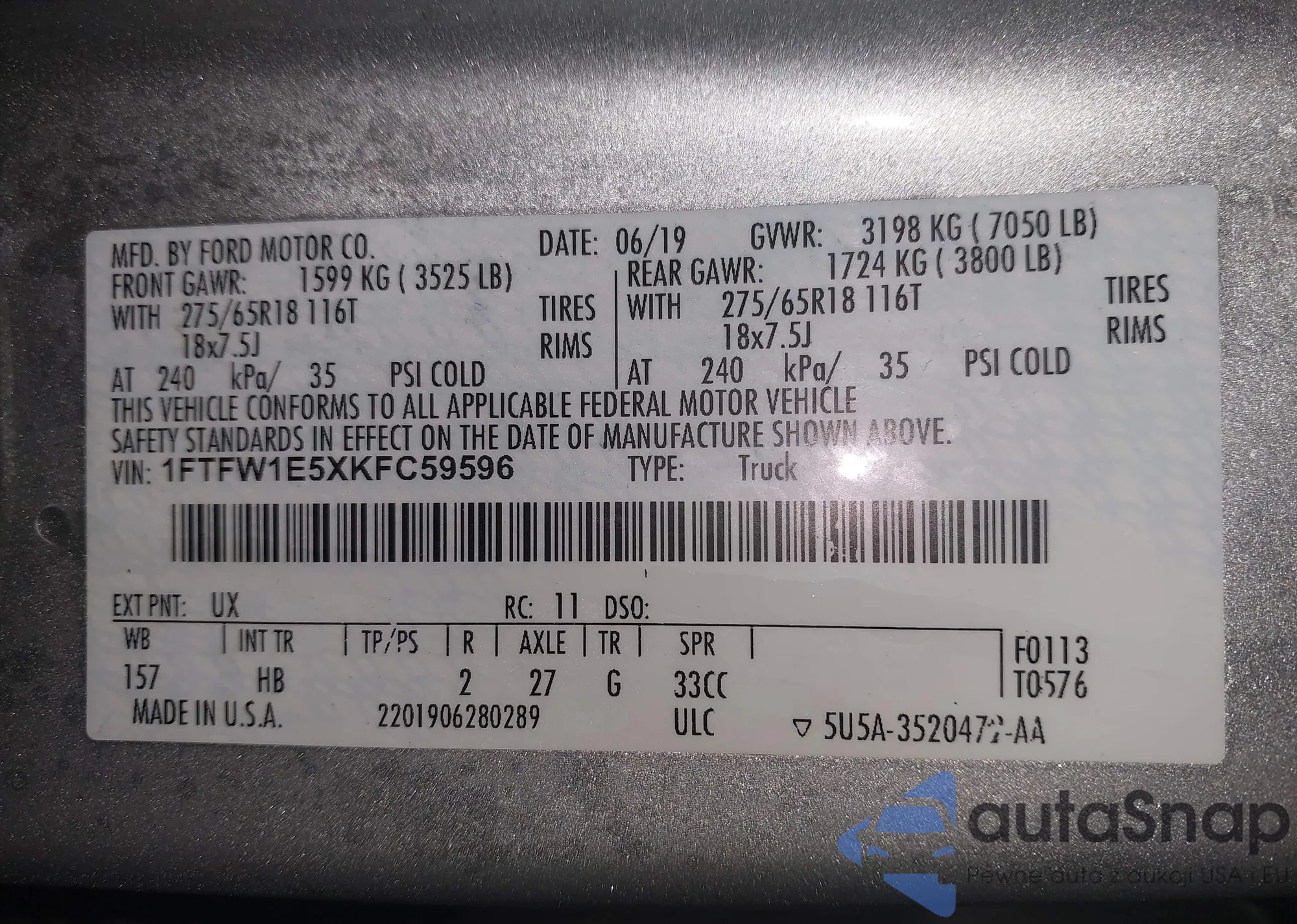 LOT: 43941464 VIN: 1FTFW1E5XKFC59596