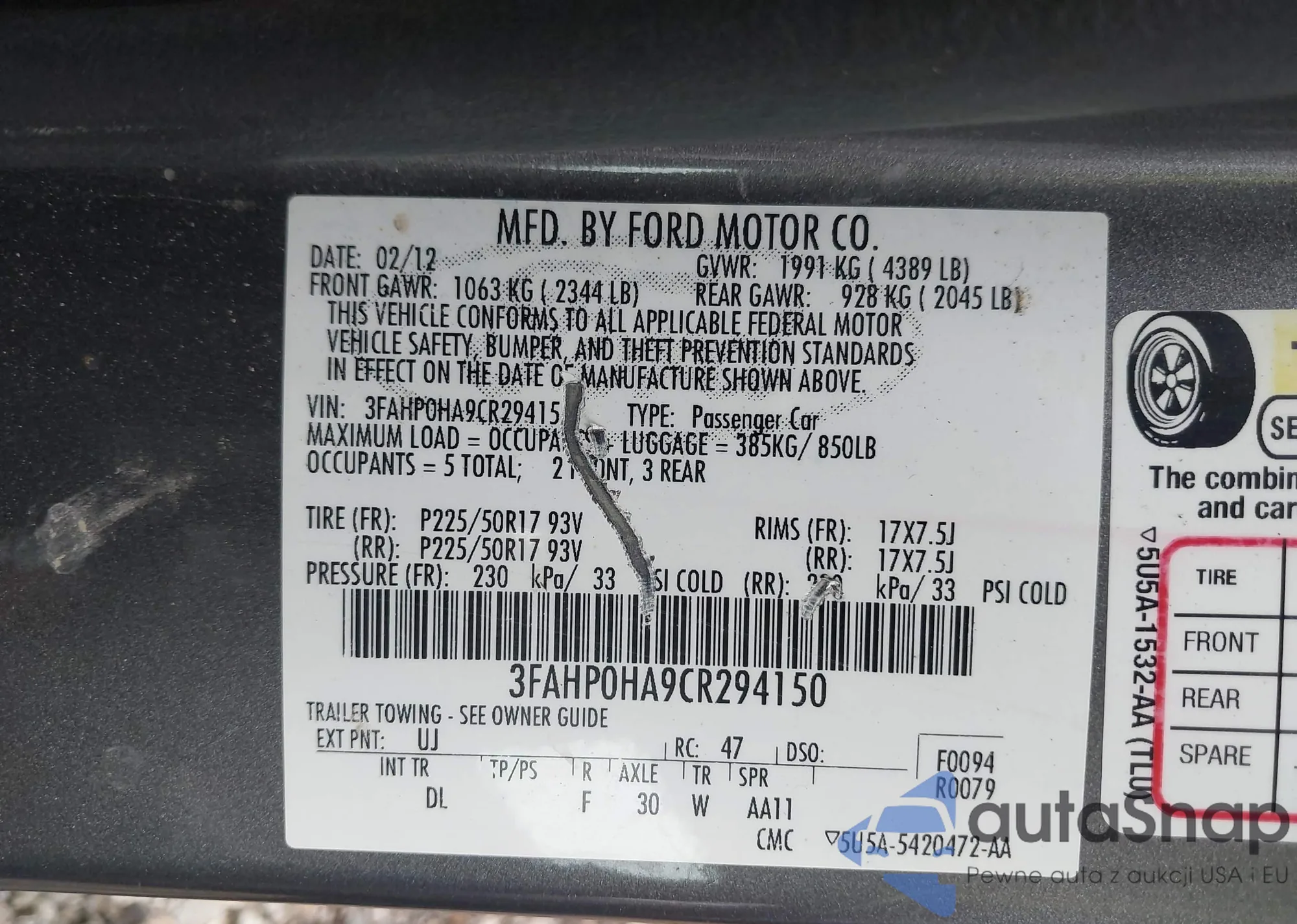 • VIN 3FAHP0HA9CR294150