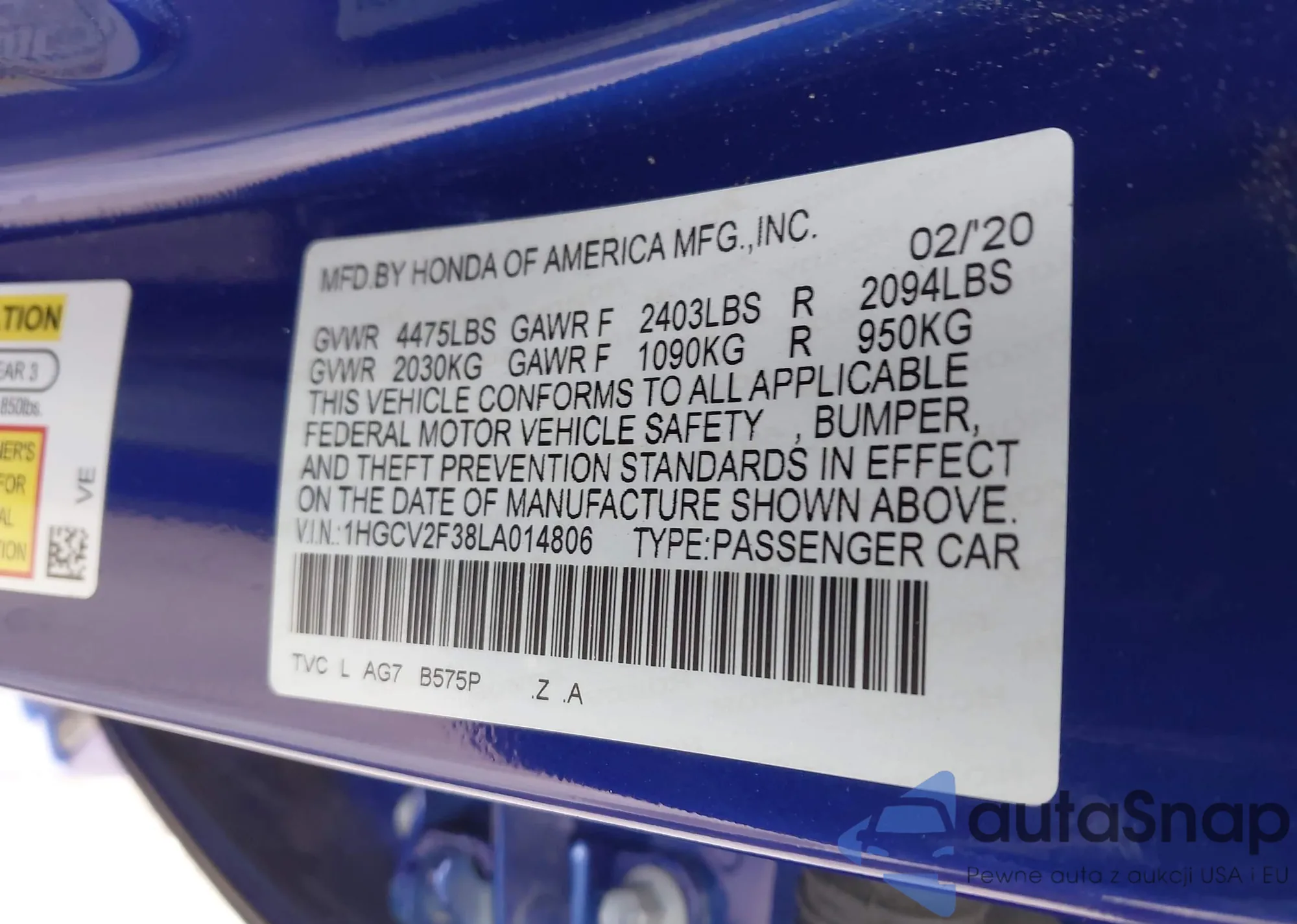 LOT: 43762413 VIN: 1HGCV2F38LA014806