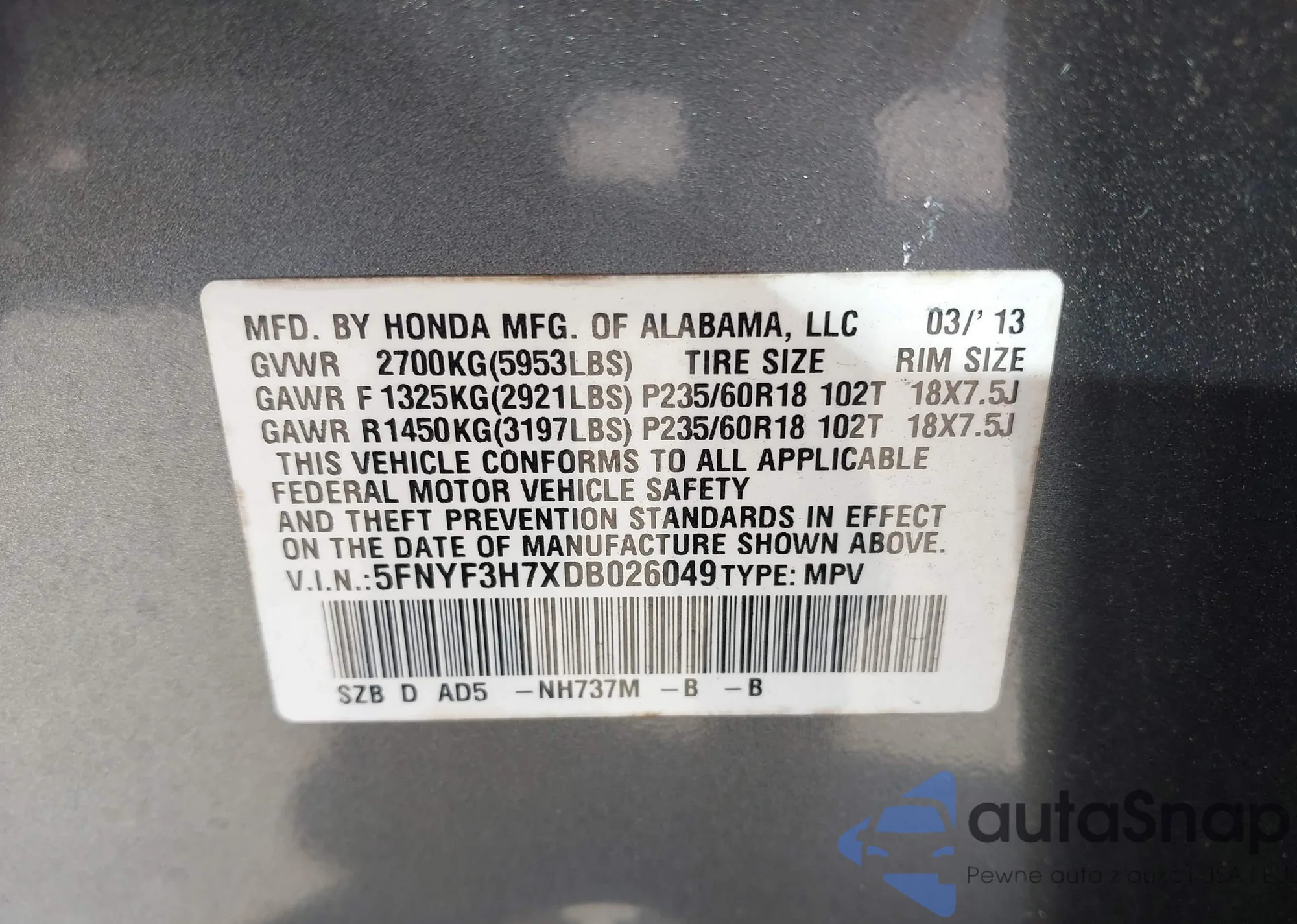 • VIN 5FNYF3H7XDB026049