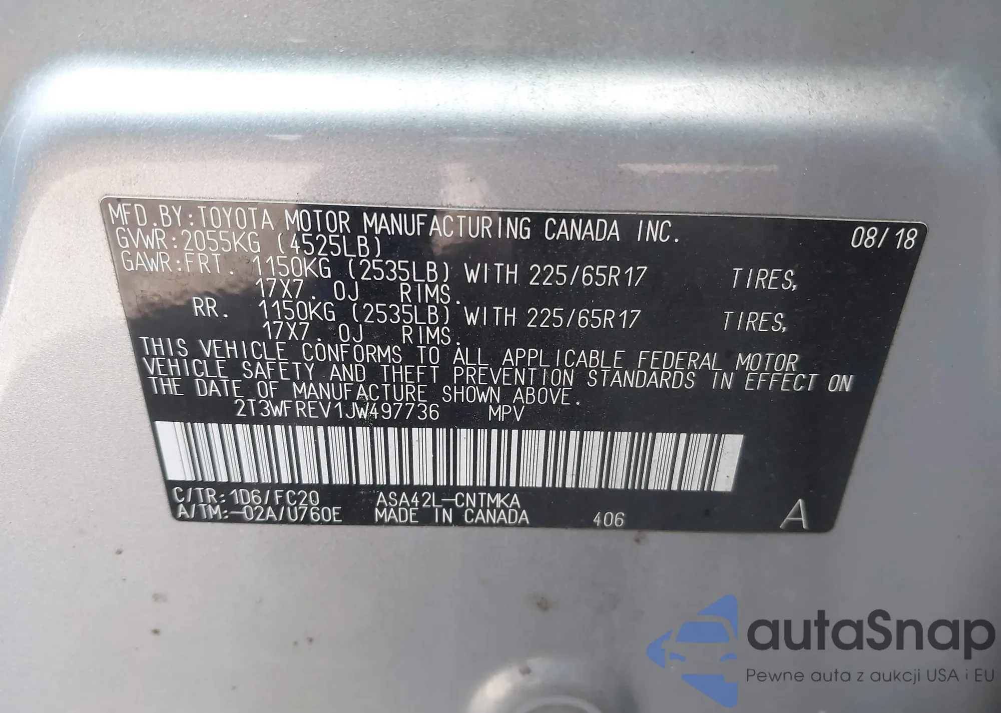LOT: 44274444 VIN: 2T3WFREV1JW497736