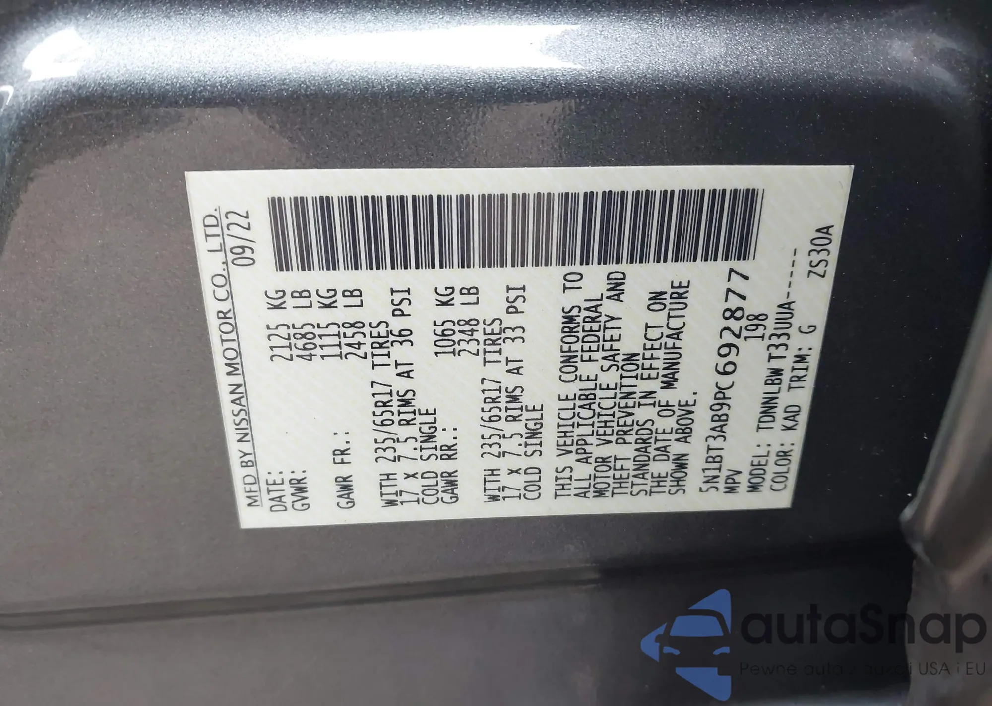 • VIN 5N1BT3AB9PC692877