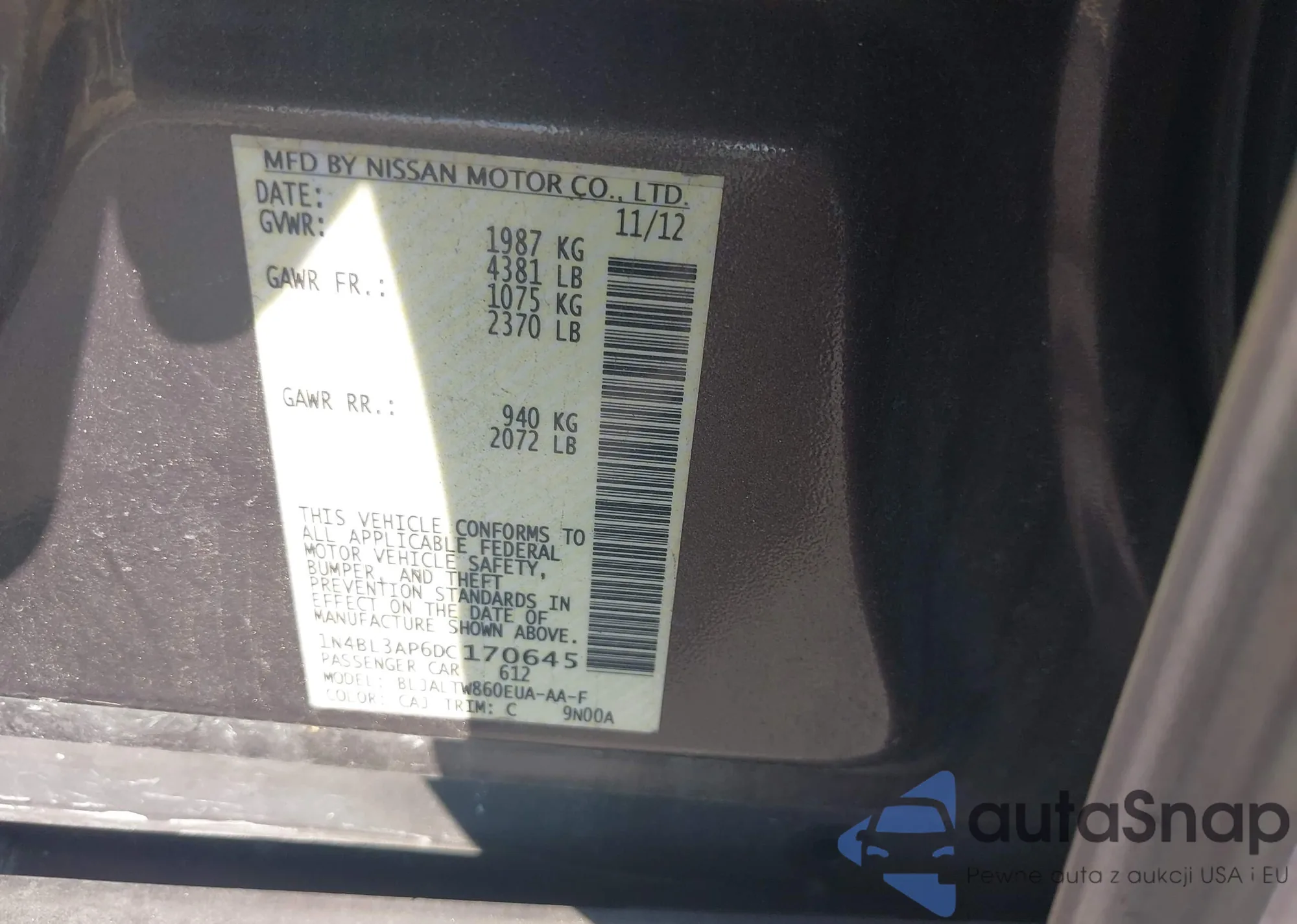 • VIN 1N4BL3AP6DC170645