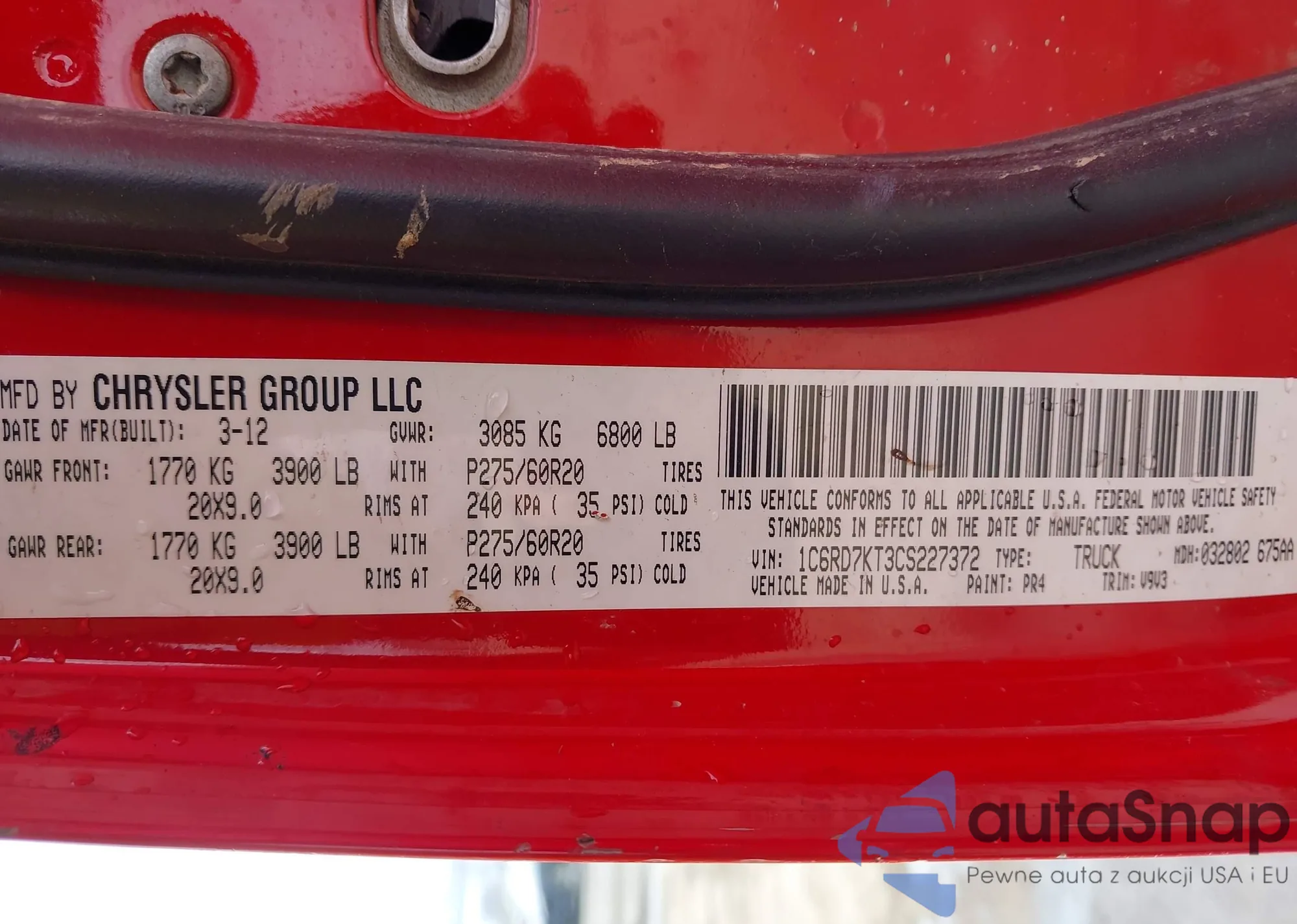 LOT: 41816084 VIN: 1C6RD7KT3CS227372