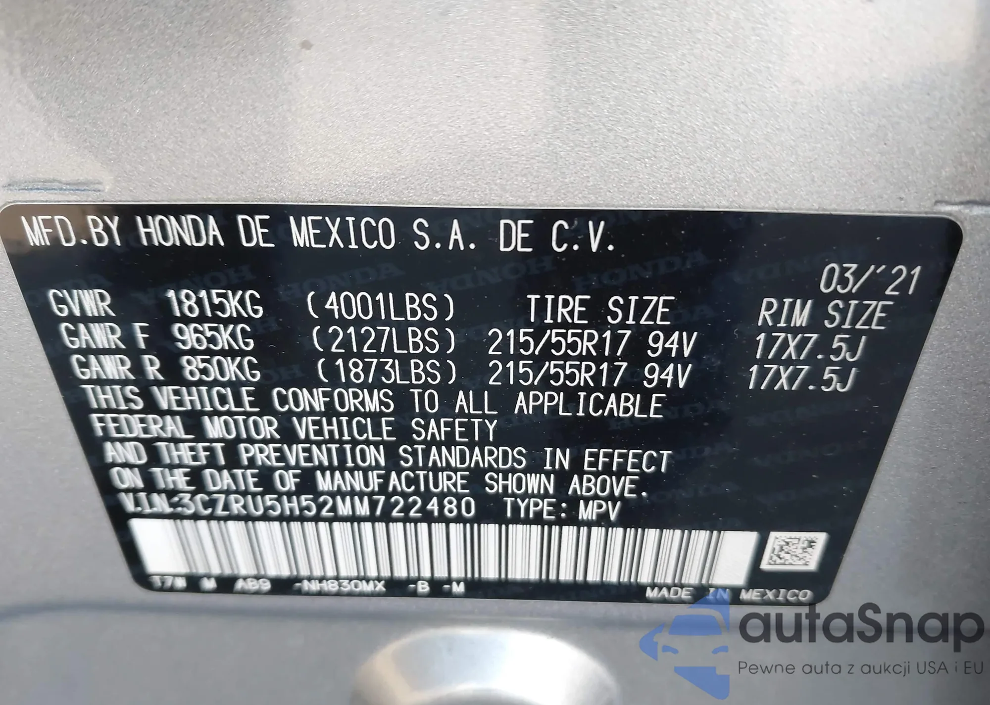 • VIN 3CZRU5H52MM722480