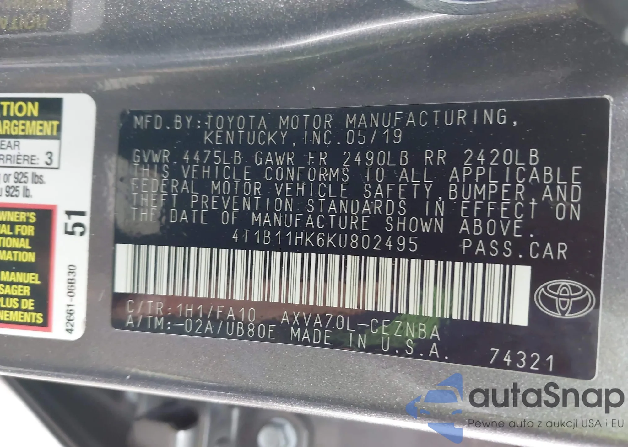 • VIN 4T1B11HK6KU802495