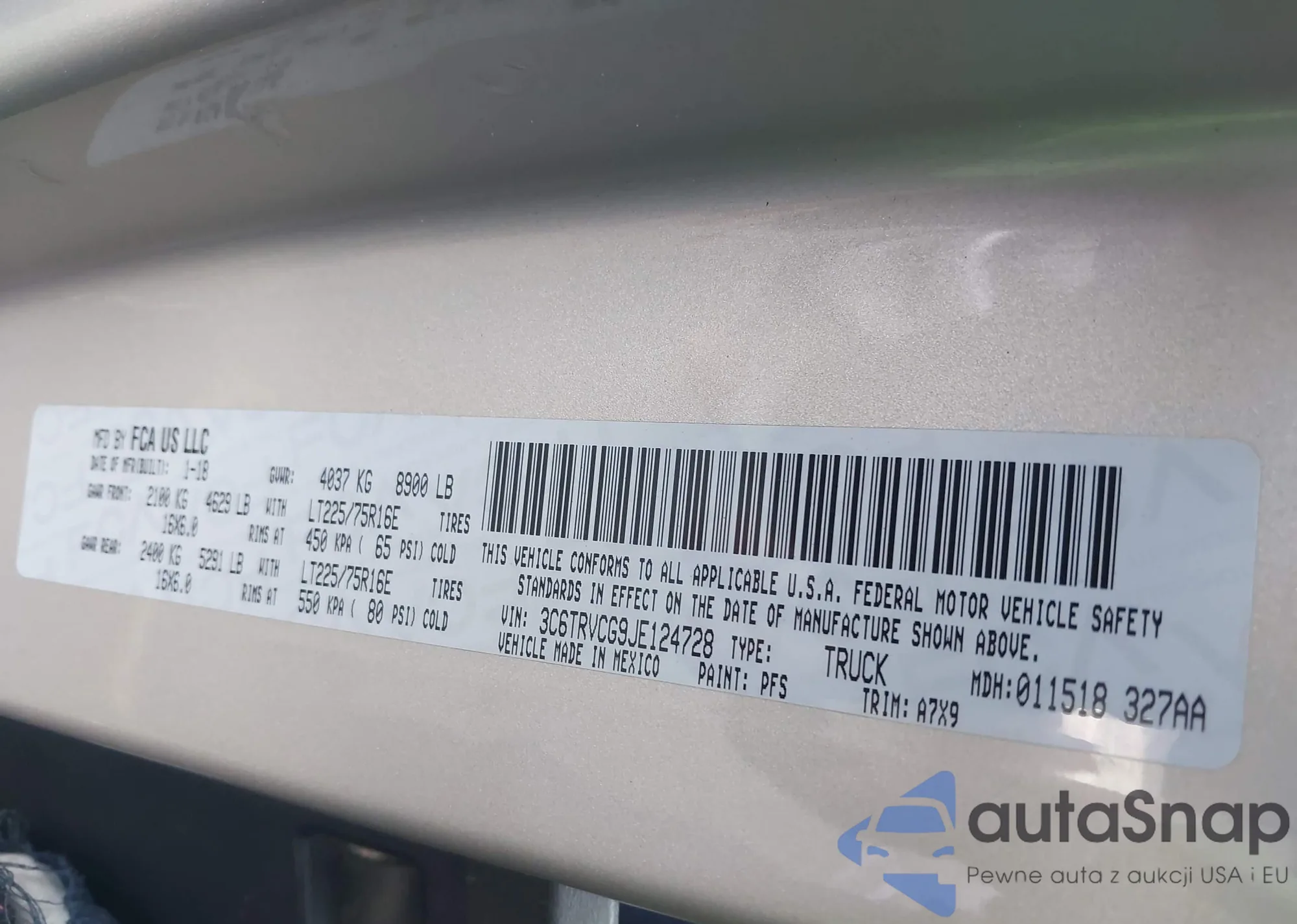 • VIN 3C6TRVCG9JE124728