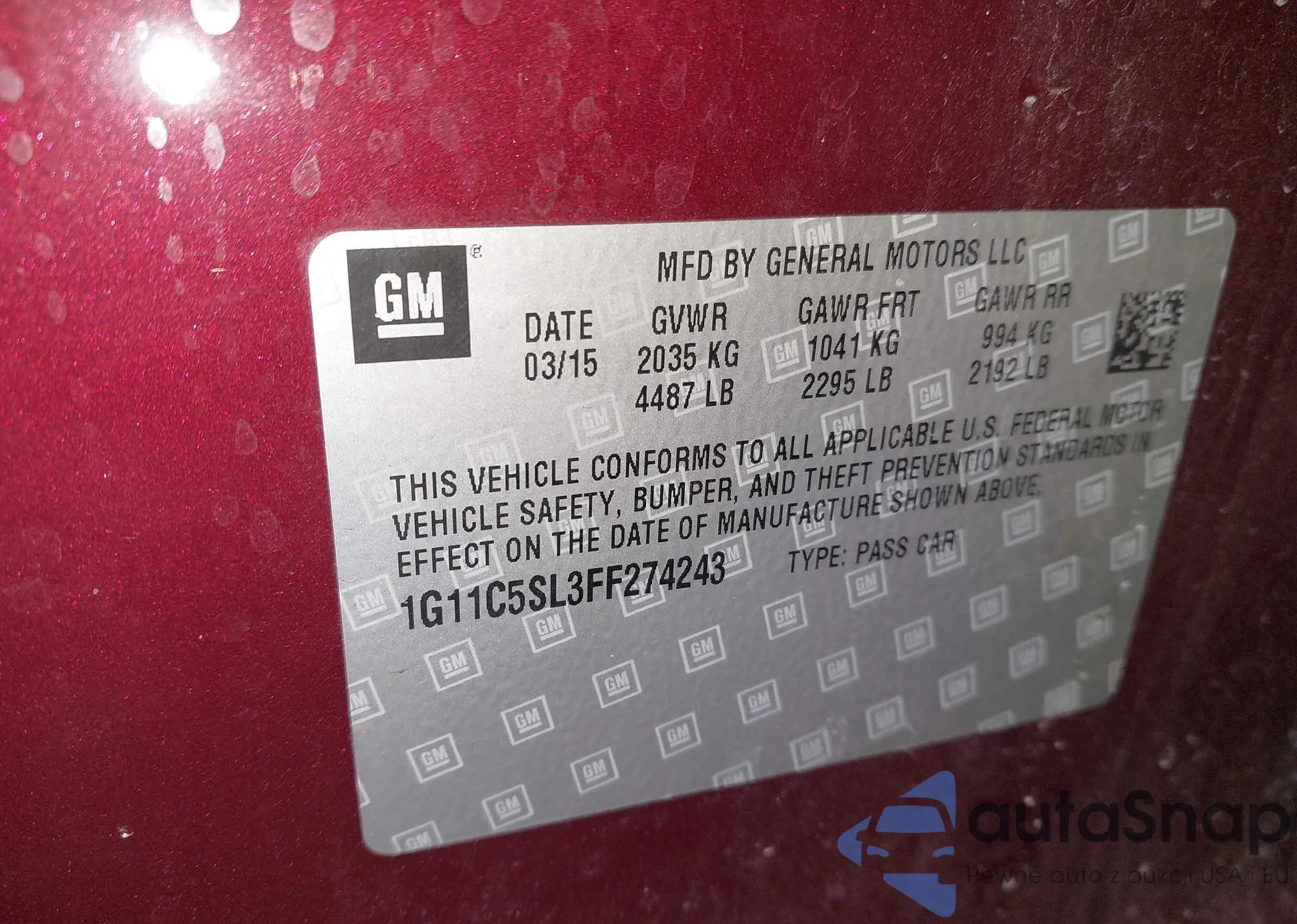 LOT: 44187937 VIN: 1G11C5SL3FF274243