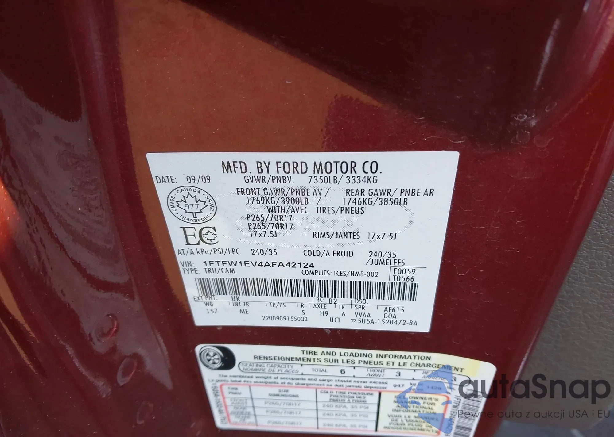 2010 Ford F-150 Fx4/Harley-Davidson/King Ranch/Lariat/Platinum/Xl/Xlt из США, поврежденный, VIN 1FTFW1EV4AFA42124
