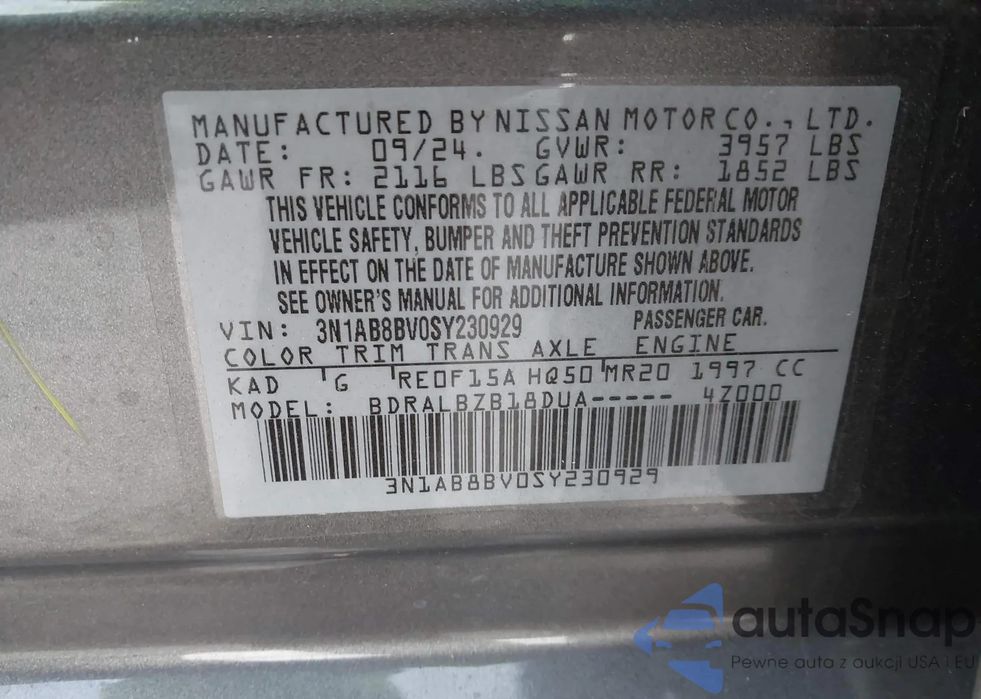 LOT: 44033590 VIN: 3N1AB8BV0SY230929