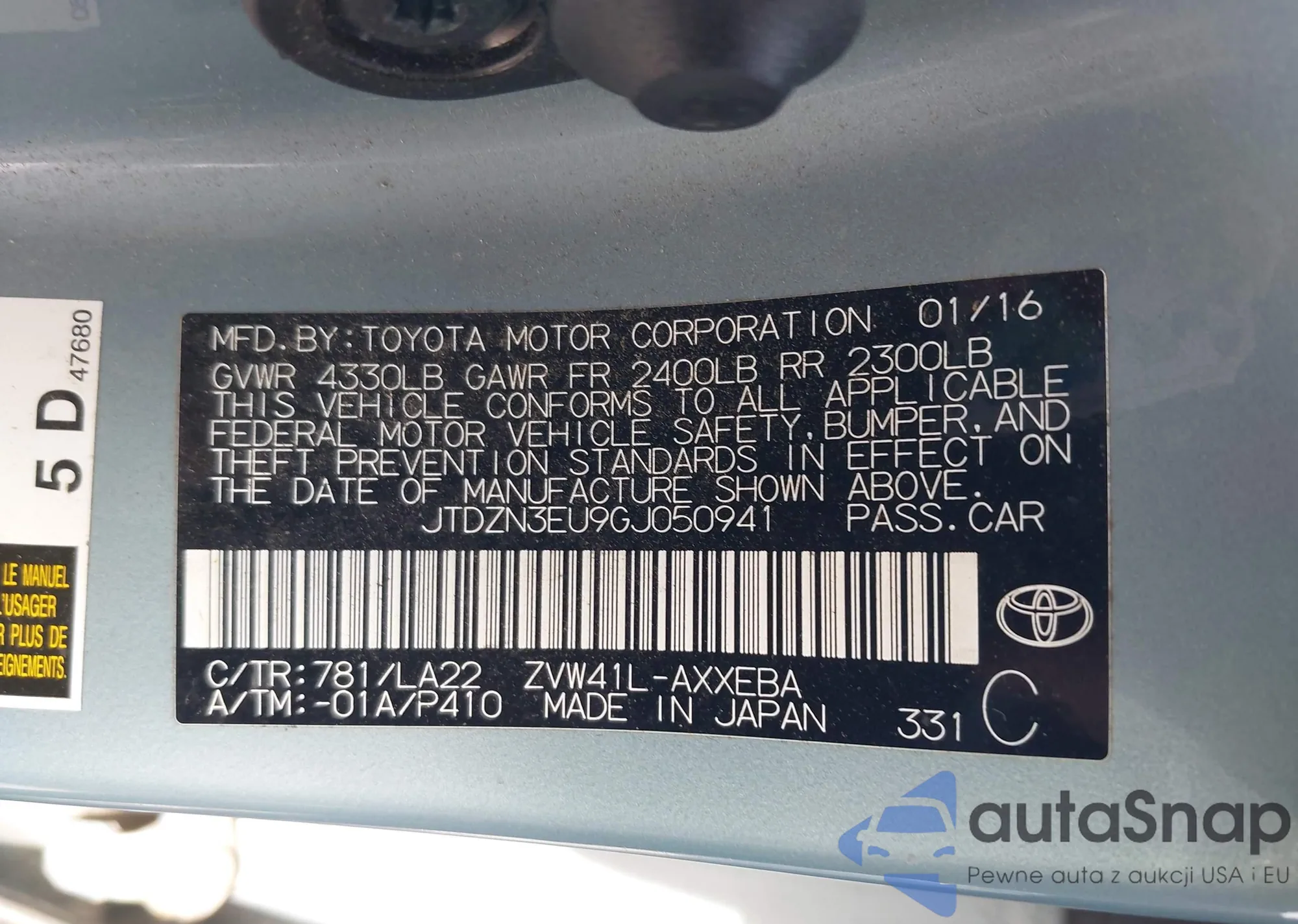 LOT: 44357255 VIN: JTDZN3EU9GJ050941
