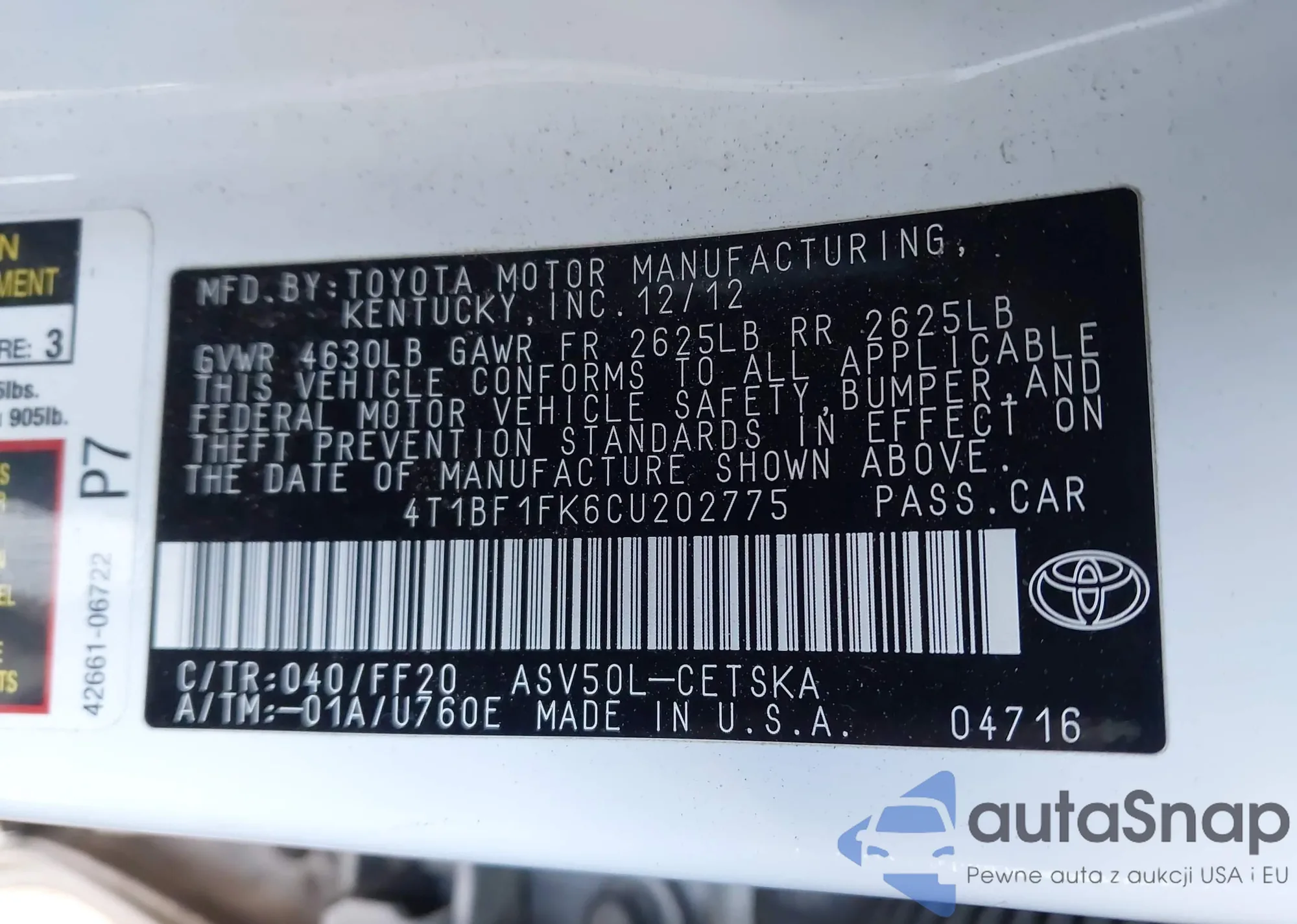 • VIN 4T1BF1FK6CU202775