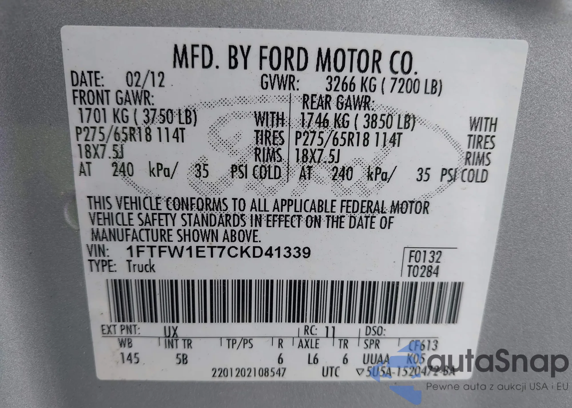 • VIN 1FTFW1ET7CKD41339