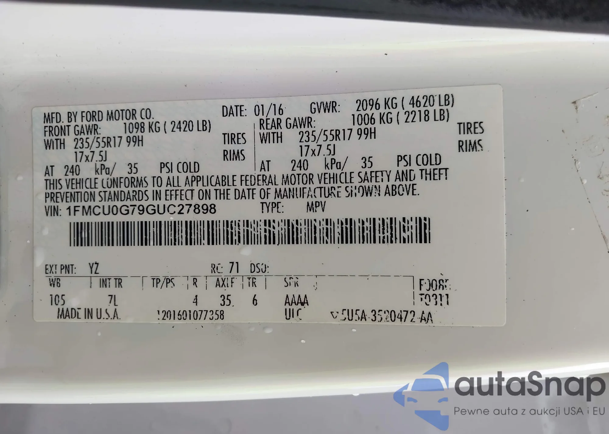 LOT: 42728649 VIN: 1FMCU0G79GUC27898