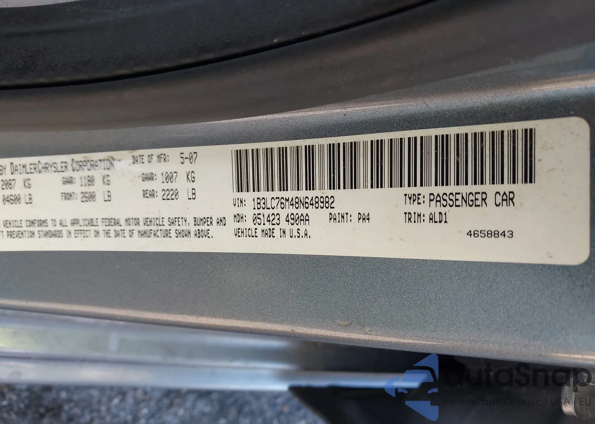 LOT: 44061258 VIN: 1B3LC76M48N648982
