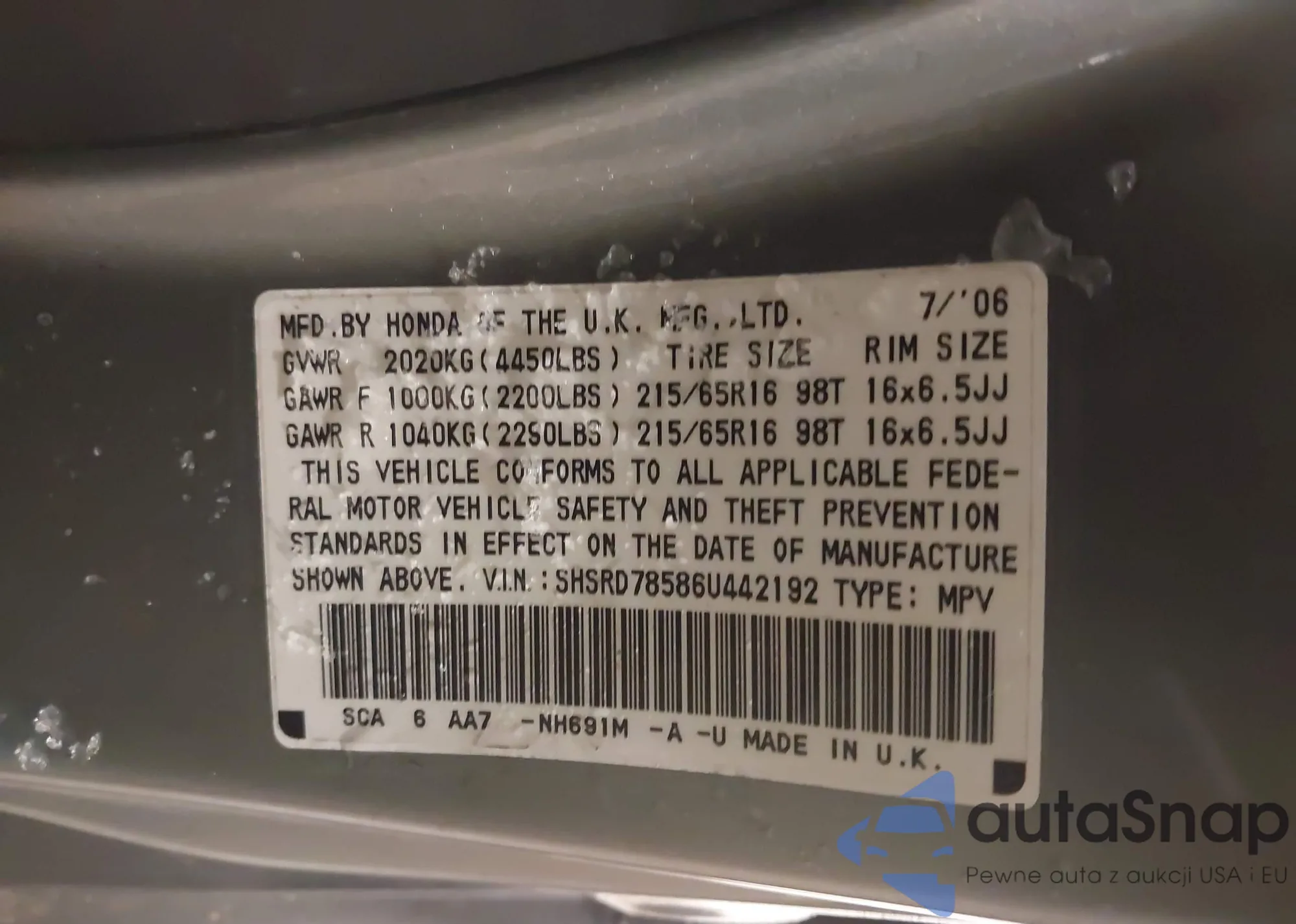 • VIN SHSRD78586U442192